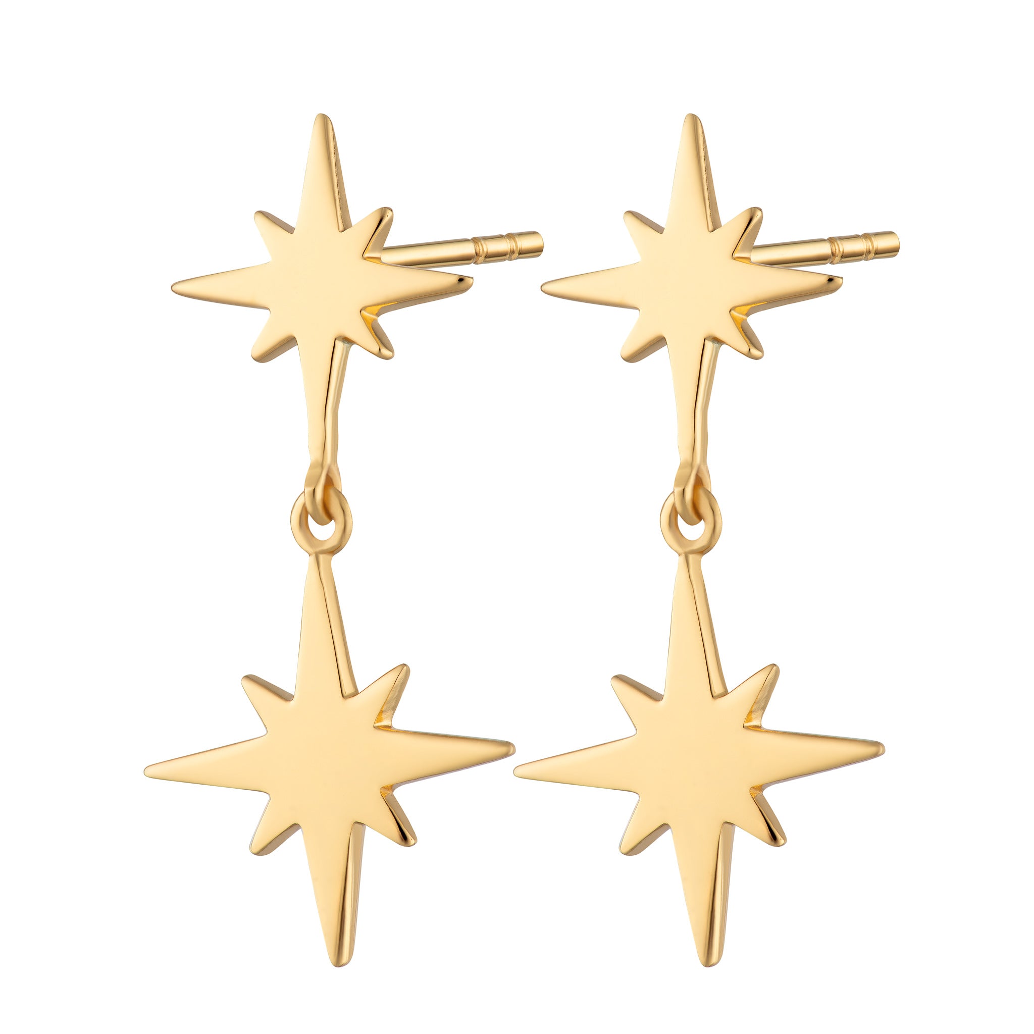 Offering a stylish twist to the classic star stud these double star drop earrings have been given extra length for added movement and shine. Featuring two polished north stars with a mirror like finish each starry earring catches the light as you move for some celestial sparkle.