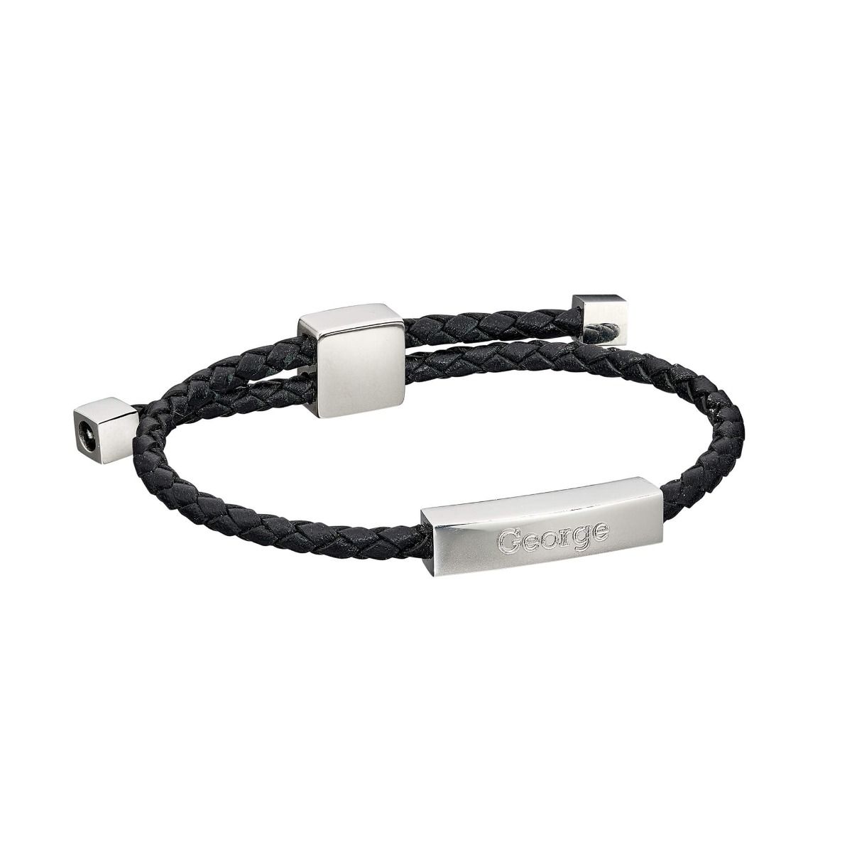 Crafted in black plaited leather, this bracelet features a pull toggle clasp for an adjustable length and a stainless steel engravable bar for personalisation.