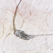 The Feather Wisp Necklet gracefully embodies the ideals of honour, connection, strength, trust, and wisdom in beautiful Sterling Silver. Featuring a refined and delicate feather motif, this necklace is symbolic of cherished moments of love and beauty.