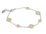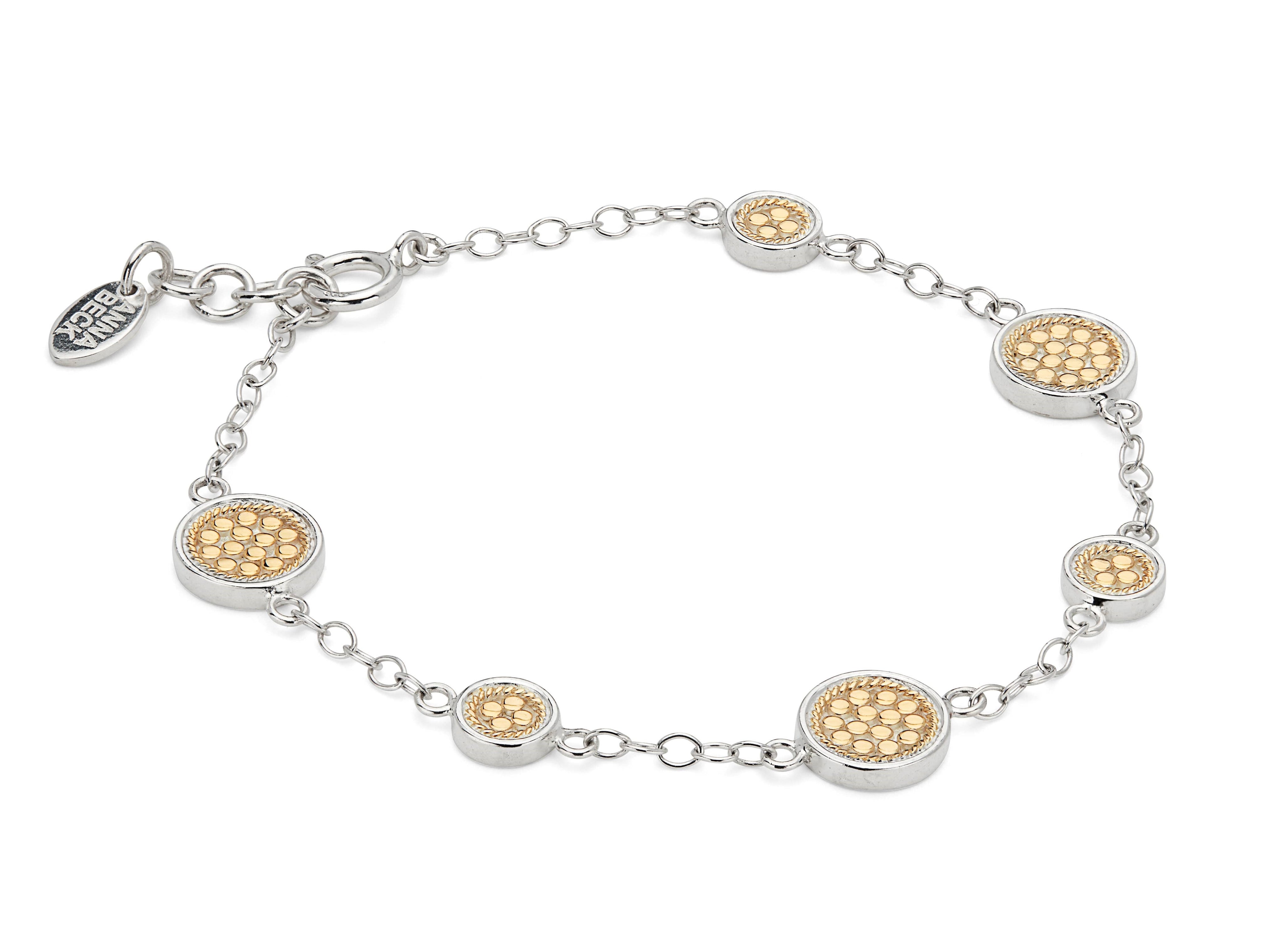 A beautiful handmade piece by Anna Beck, the classic station bracelet. This is the perfect accompaniment to any of the Anna Beck designs, this bracelet combines the soft 18ct gold plate & fresh silver with stationary discs for the ultimate boho look.