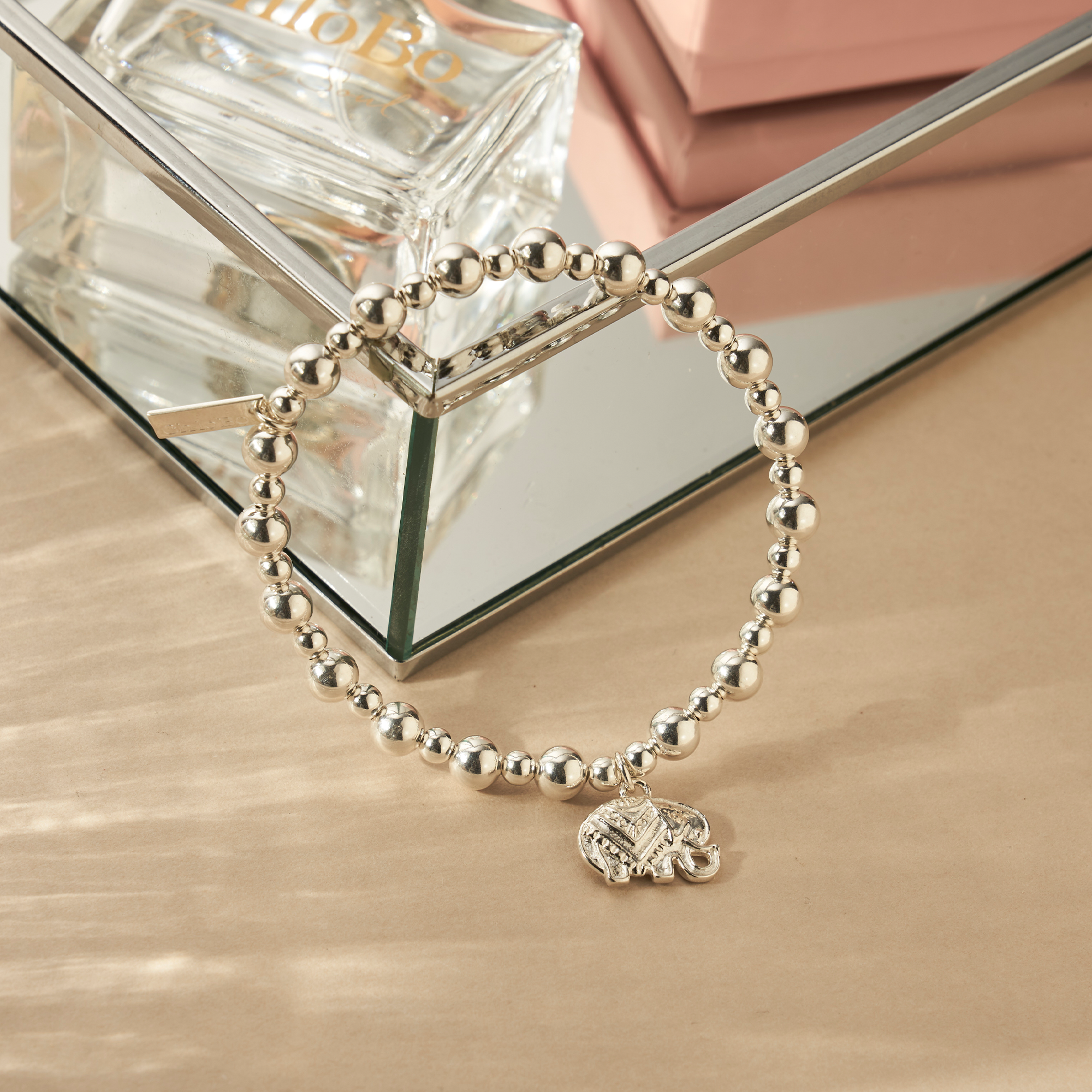 Featuring mini and small ball beads, this is the perfect piece for adding volume to your stack. Decorated with an elephant charm, this piece represents strength, wisdom and solitude.
