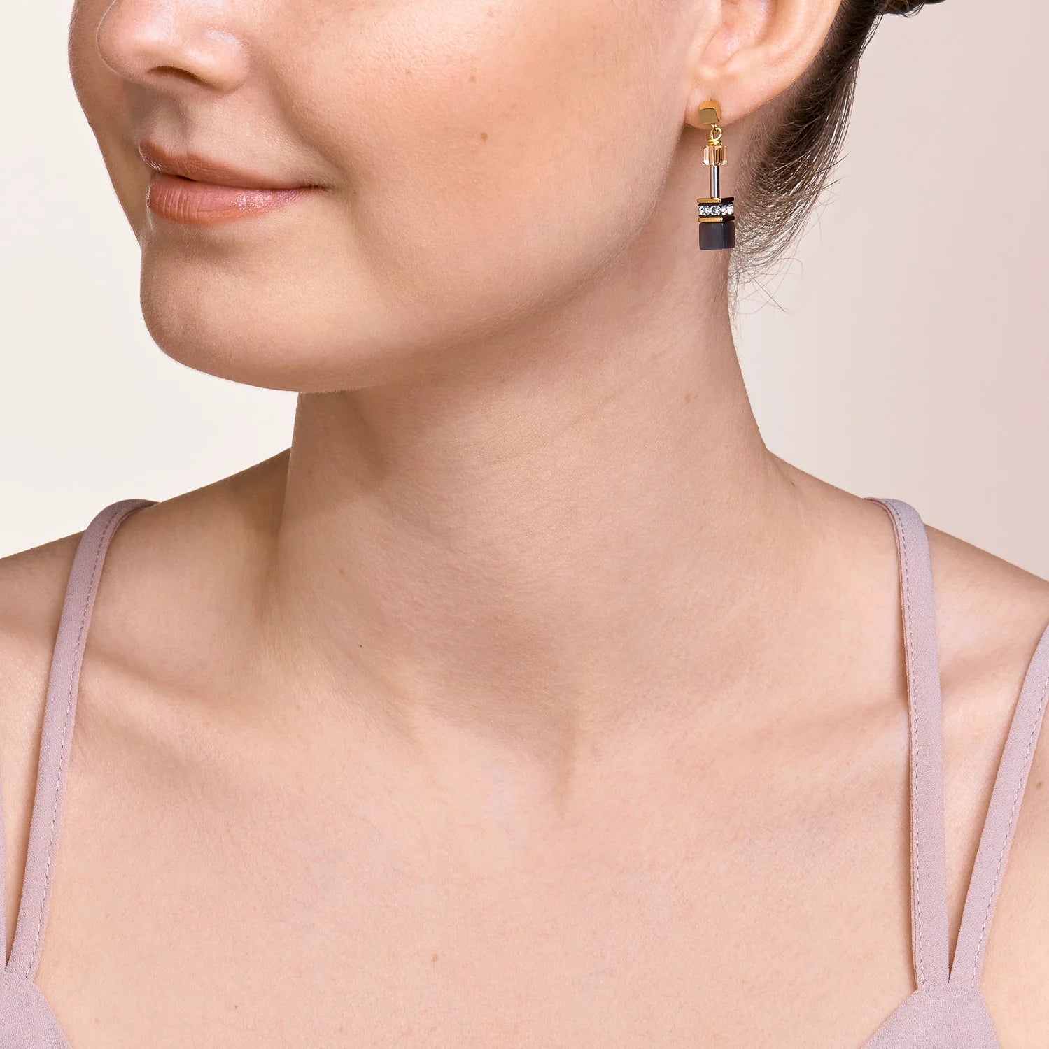 Earrings made from gold-coloured stainless steel in the famous GeoCUBE® design for an eye-catching, glamorous look. The grey tone is offset with the polished gold findings.