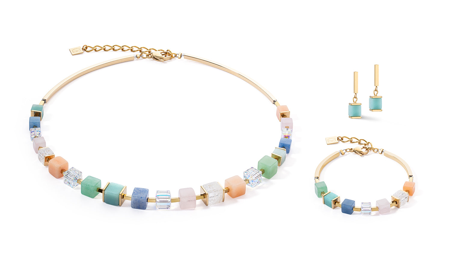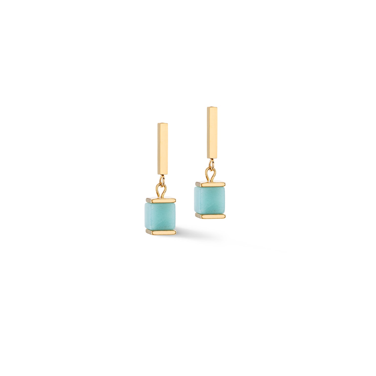 Make a statement with these 6 mm cube earrings. Here with luminous amazonite and shiny stainless steel gold.