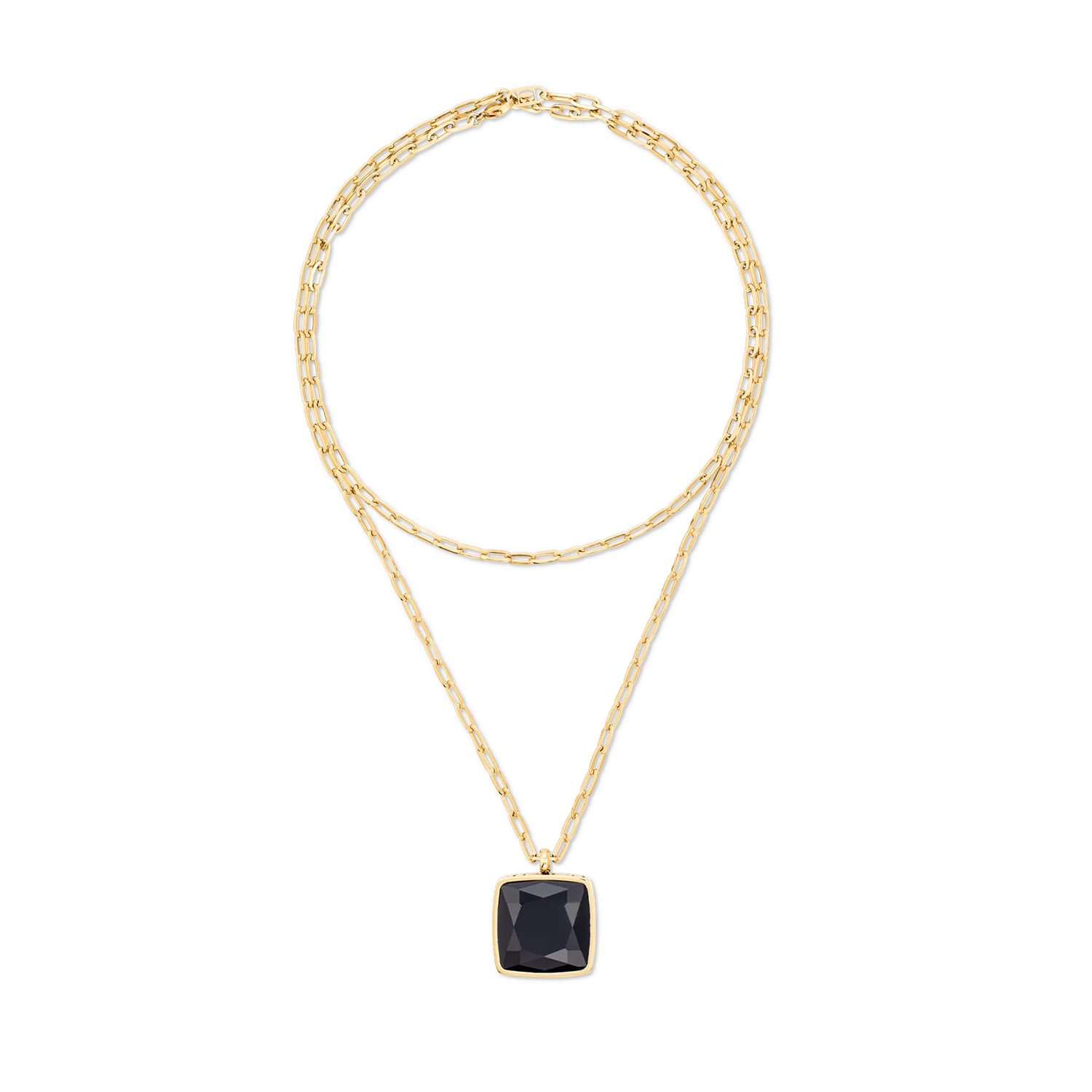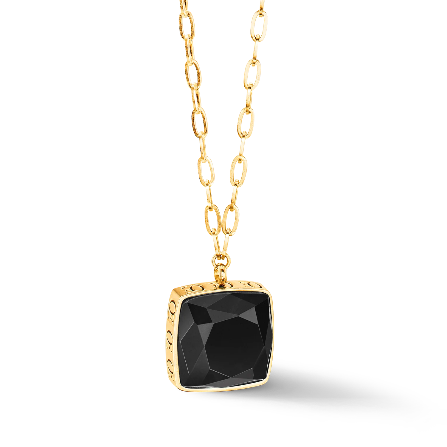 This striking piece of jewellery features a deep black onyx stone framed by a laser-engraved edge in gold. The long stainless steel link chain creates a modern, sophisticated look and gives the necklace a luxurious touch.