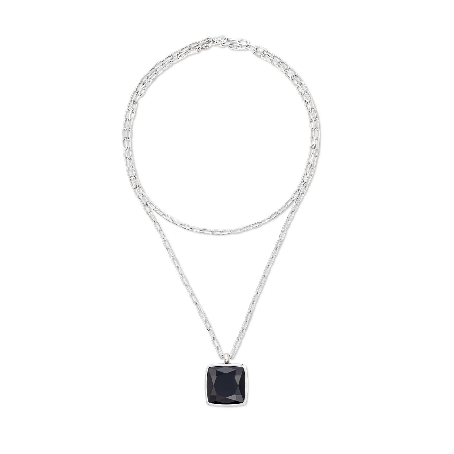 This striking piece of jewellery features a deep black onyx stone framed by a laser-engraved edge in stainless steel. The long stainless steel link chain creates a modern, sophisticated look and gives the necklace a luxurious touch.