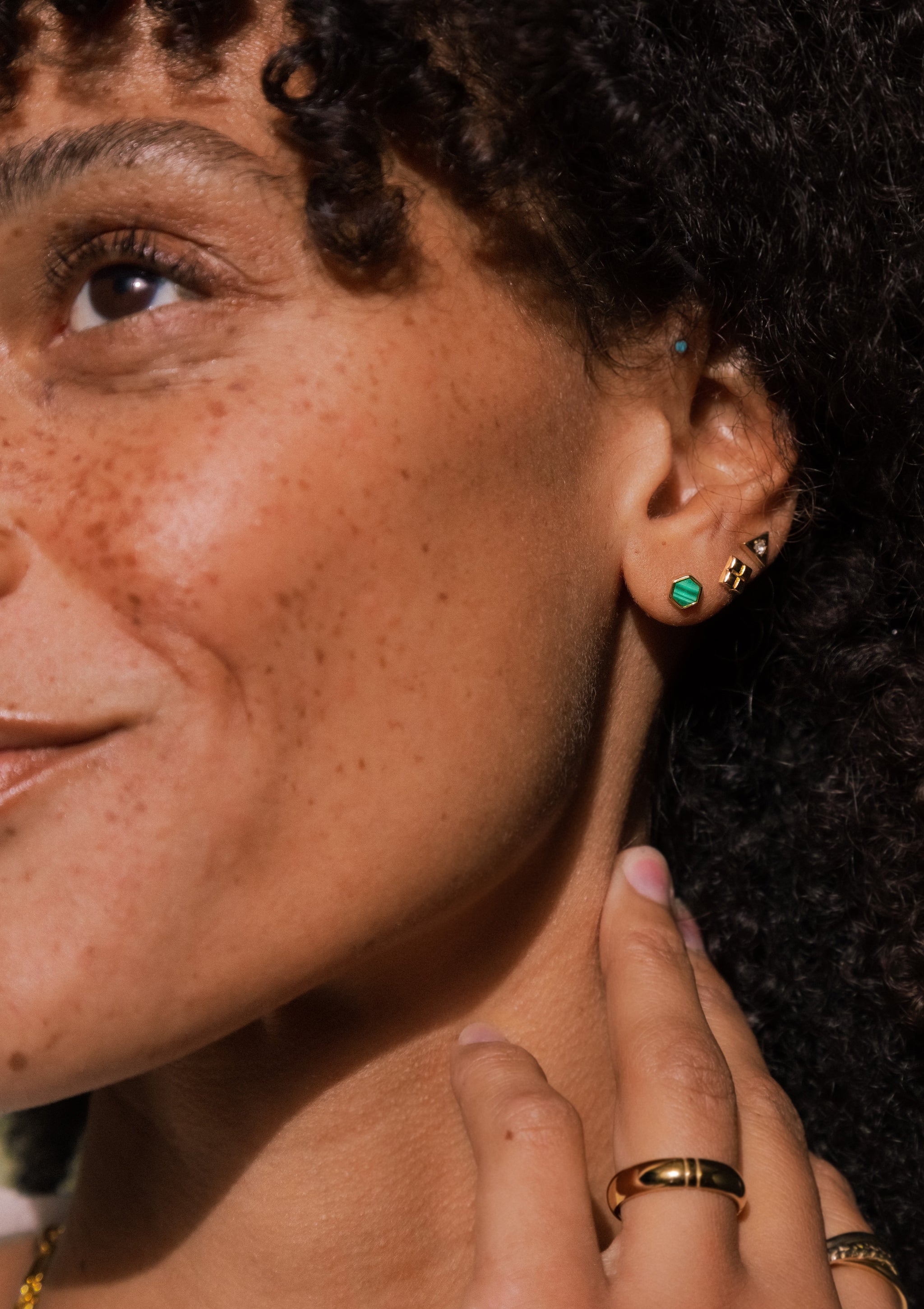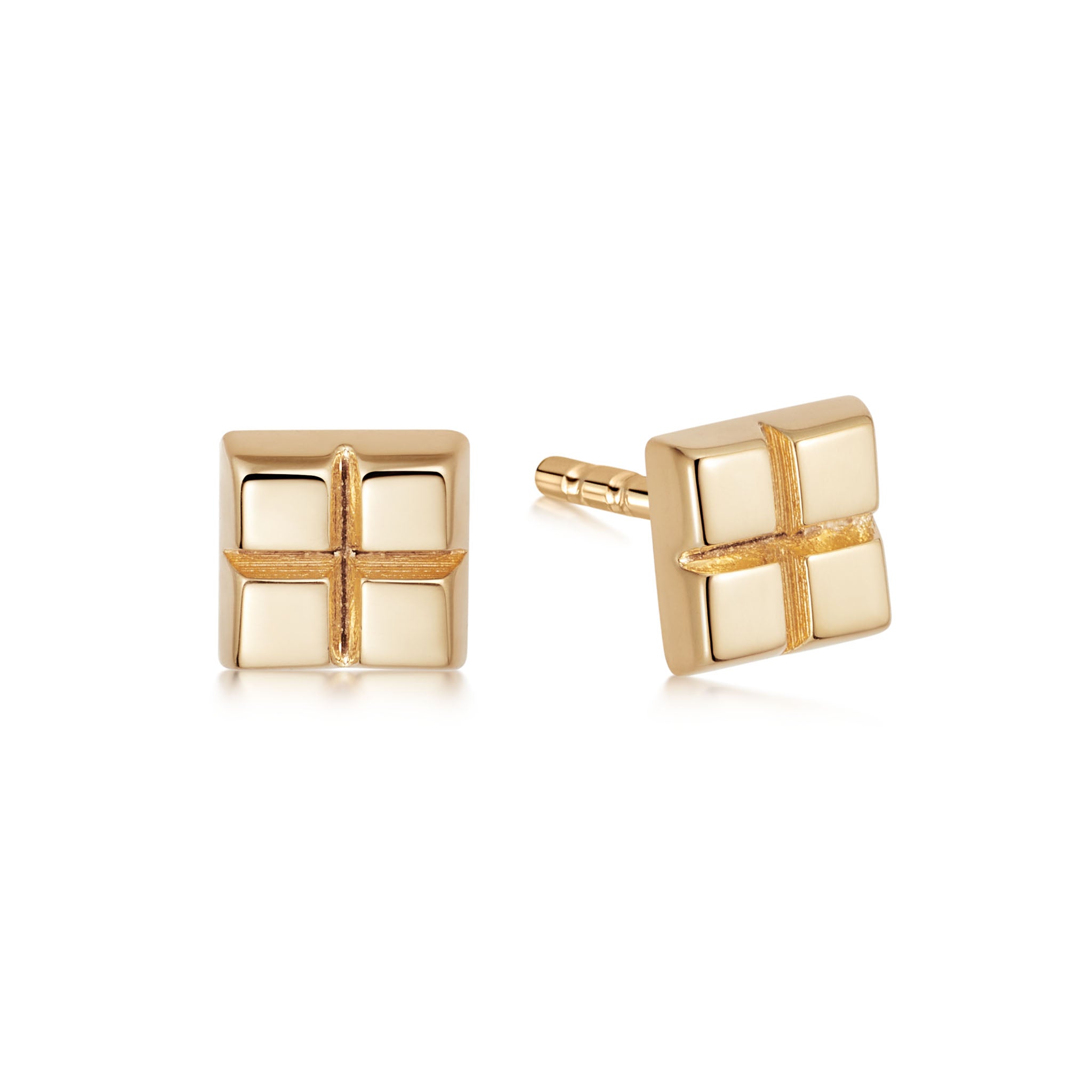 These minimal 18ct gold plated studs create the ultimate understated moment. Featuring a block of four miniature cubes, pair with some drop earrings or maxi hoops for that extra bit of bling. Also available in Silver.