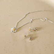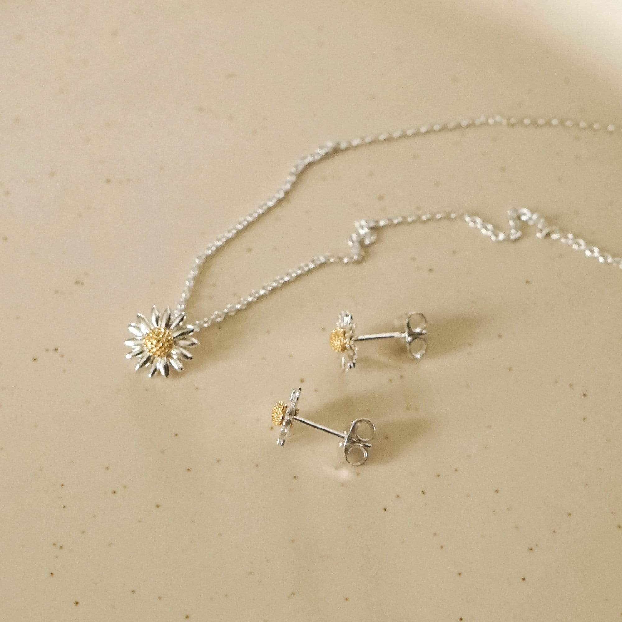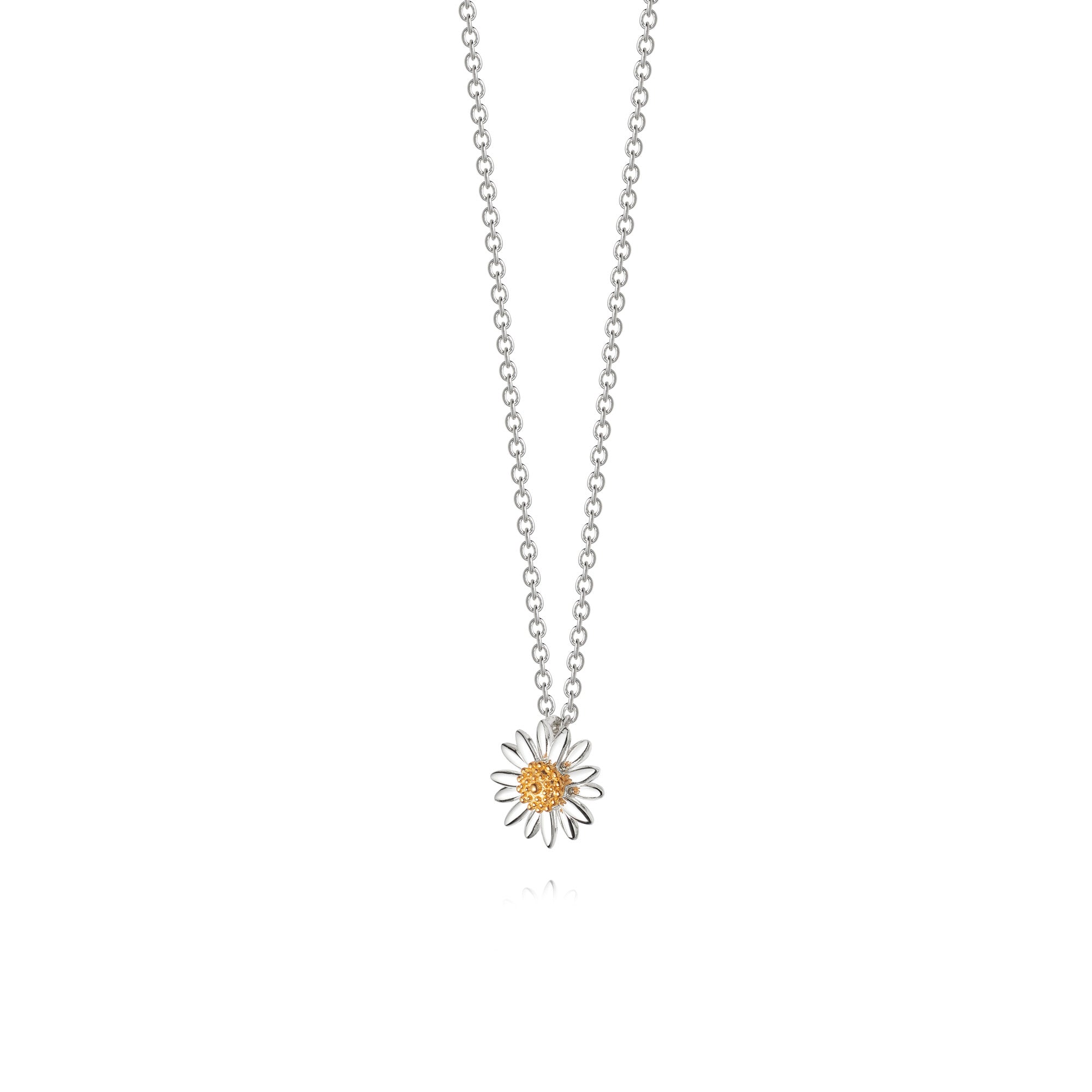Crafted from sterling silver and gold plate the Daisy necklace features a small daisy pendant hung on a rolo chain.