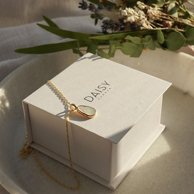 We believe in love at first sight, do you? The Isla Mother of Pearl Necklace features a slice of the smooth, iridescent stone, encased in 18ct gold plated silver hung on delicate twisted chain that is perfect to wear alongside the seashell pieces or alone as a simple statement.