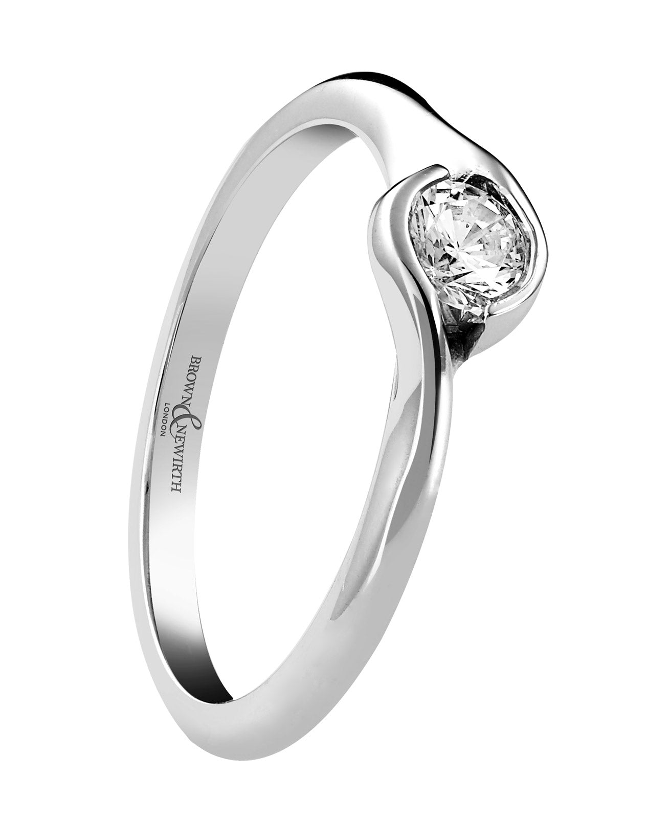 Handcrafted; organic lines form from the shoulders to hug the round brilliant cut diamond, presented here on a classic court band. 0.25ct