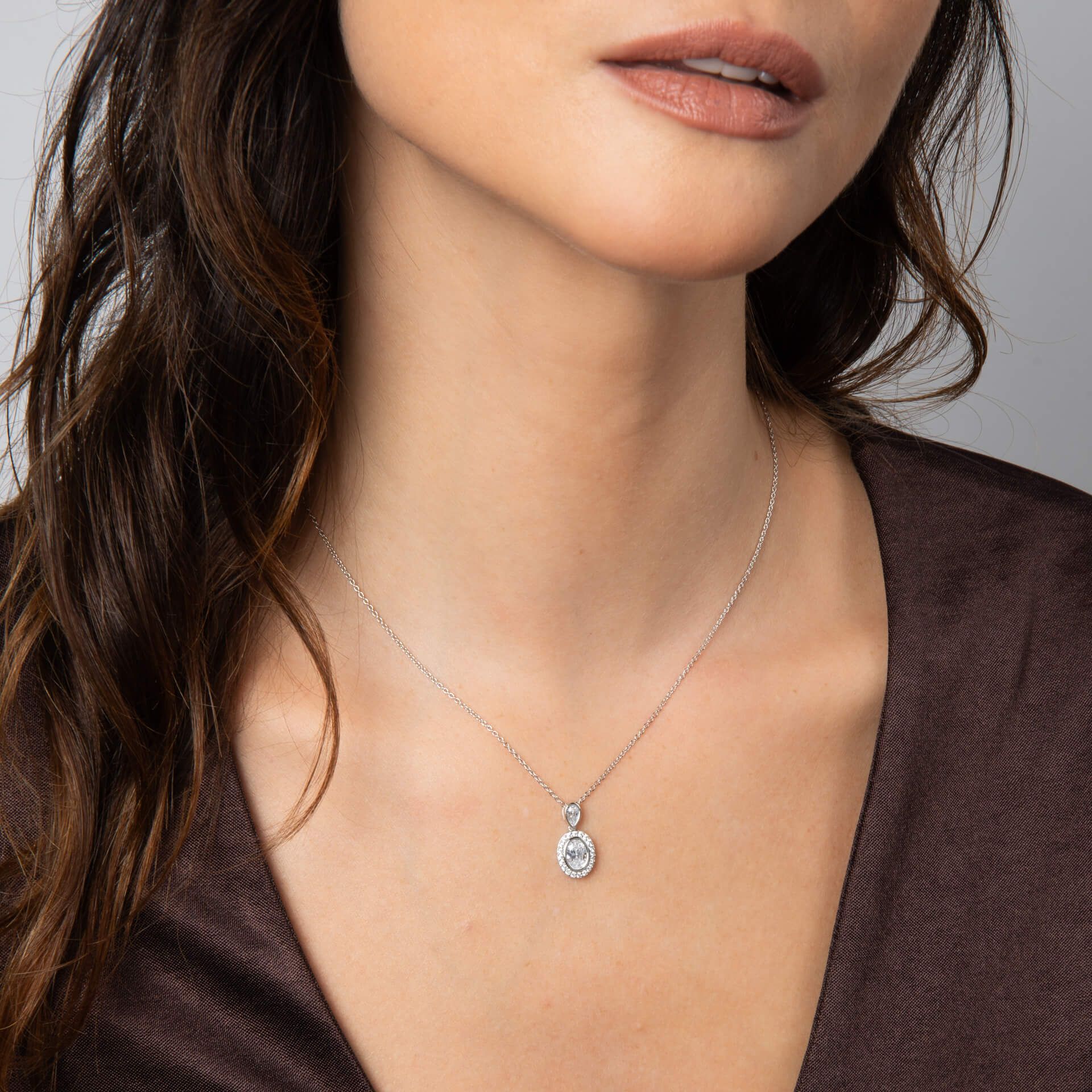 Celebrate effortless elegance with this halo drop pendant, designed to bring refined brilliance to any occasion. Showcasing Diamonfire zirconia stones, precisely cut and polished to emulate the sparkle of a genuine diamond, the oval center stone is encircled by a delicate pavé halo that enhances its radiance.