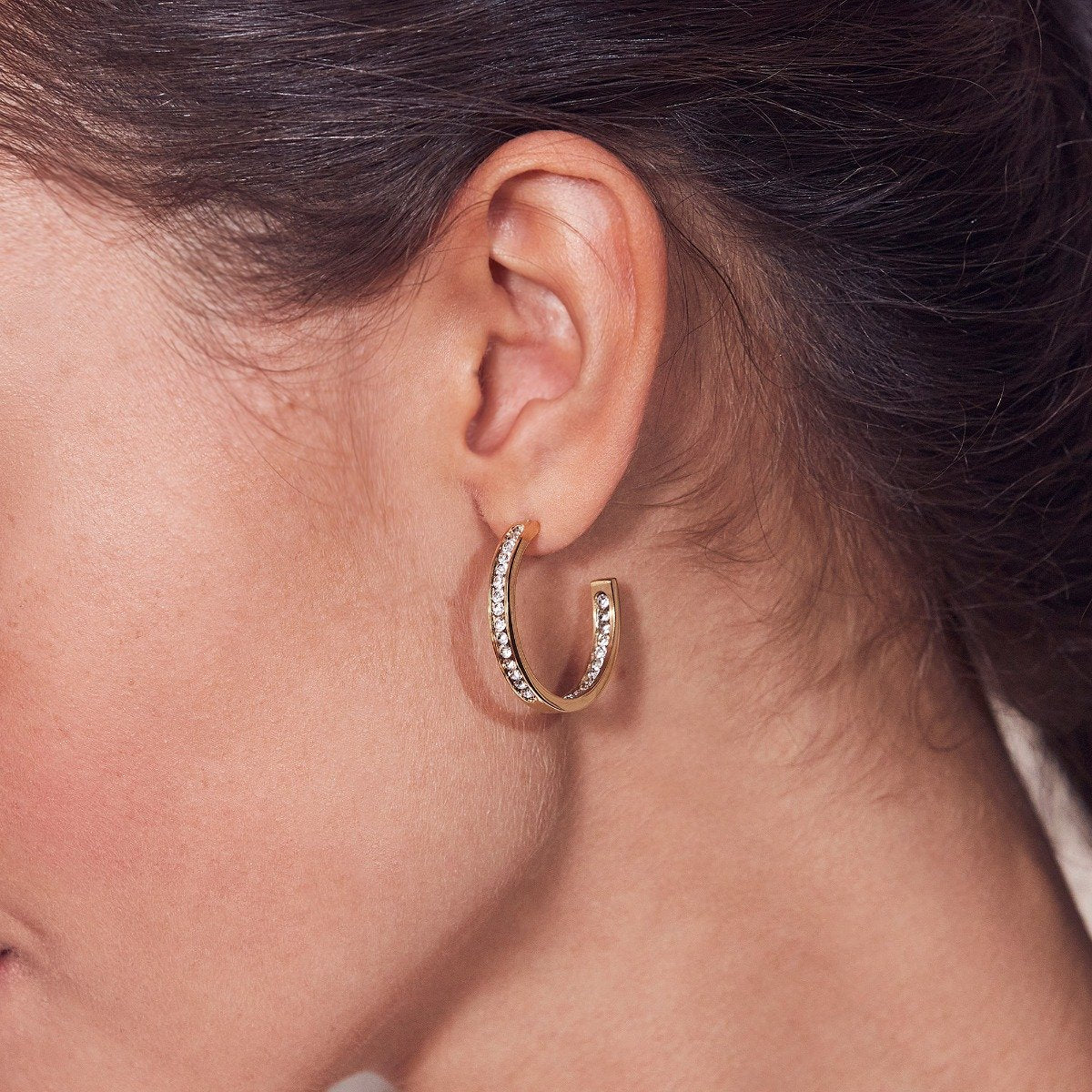 Andorra earrings small gold is half decorated with crystal clear stones on the inside and out and this medium model offers a stylish and smart design, finished in 14K gold plate.