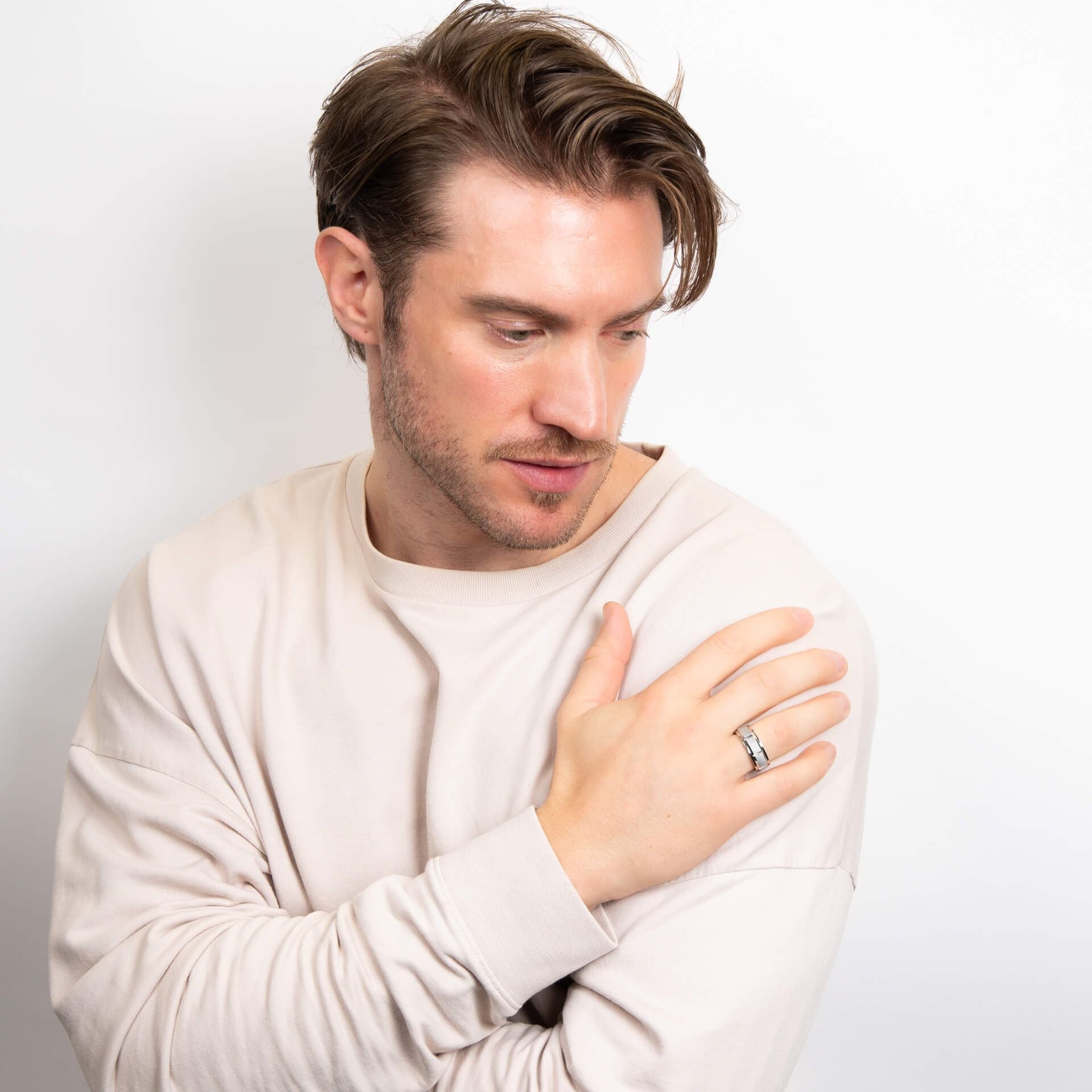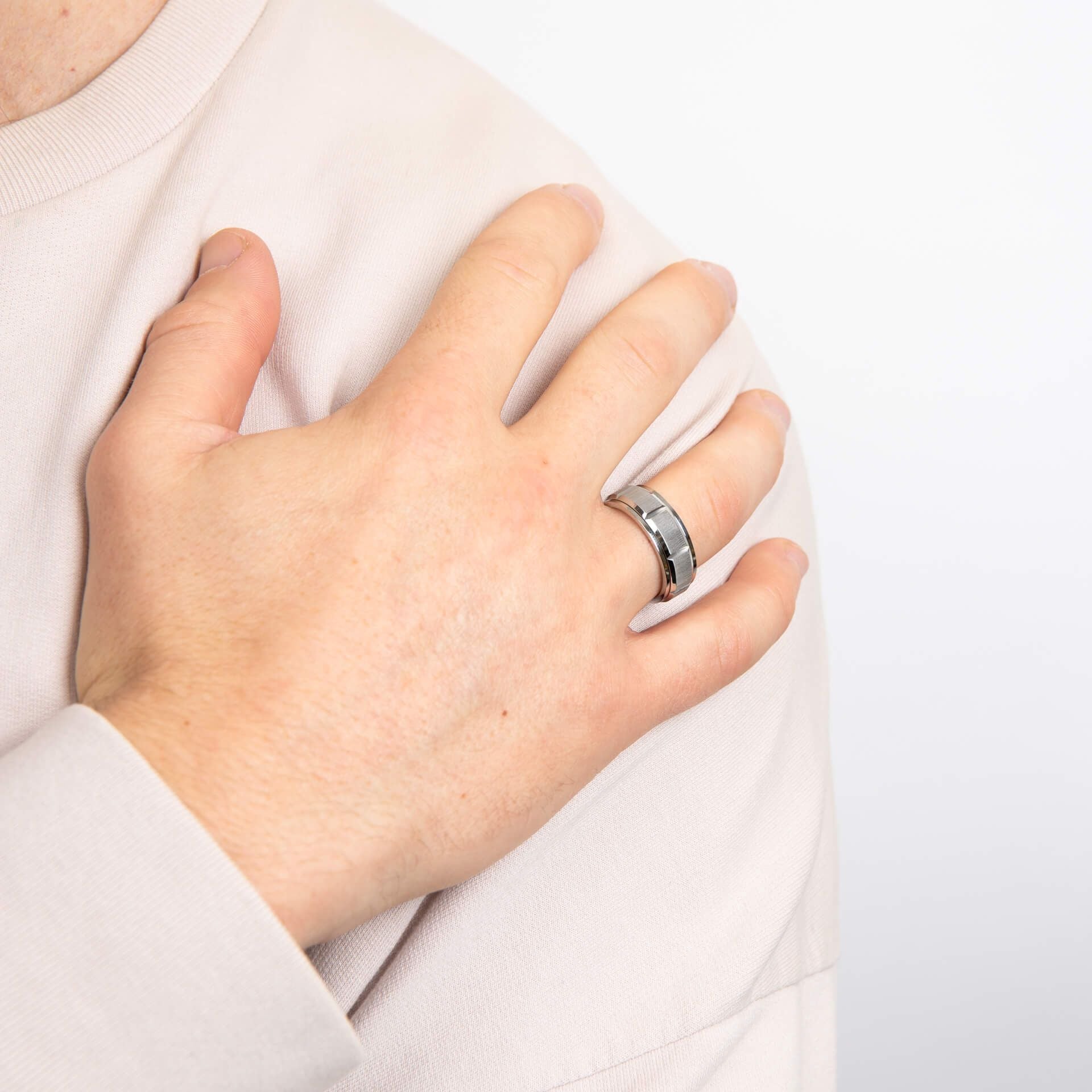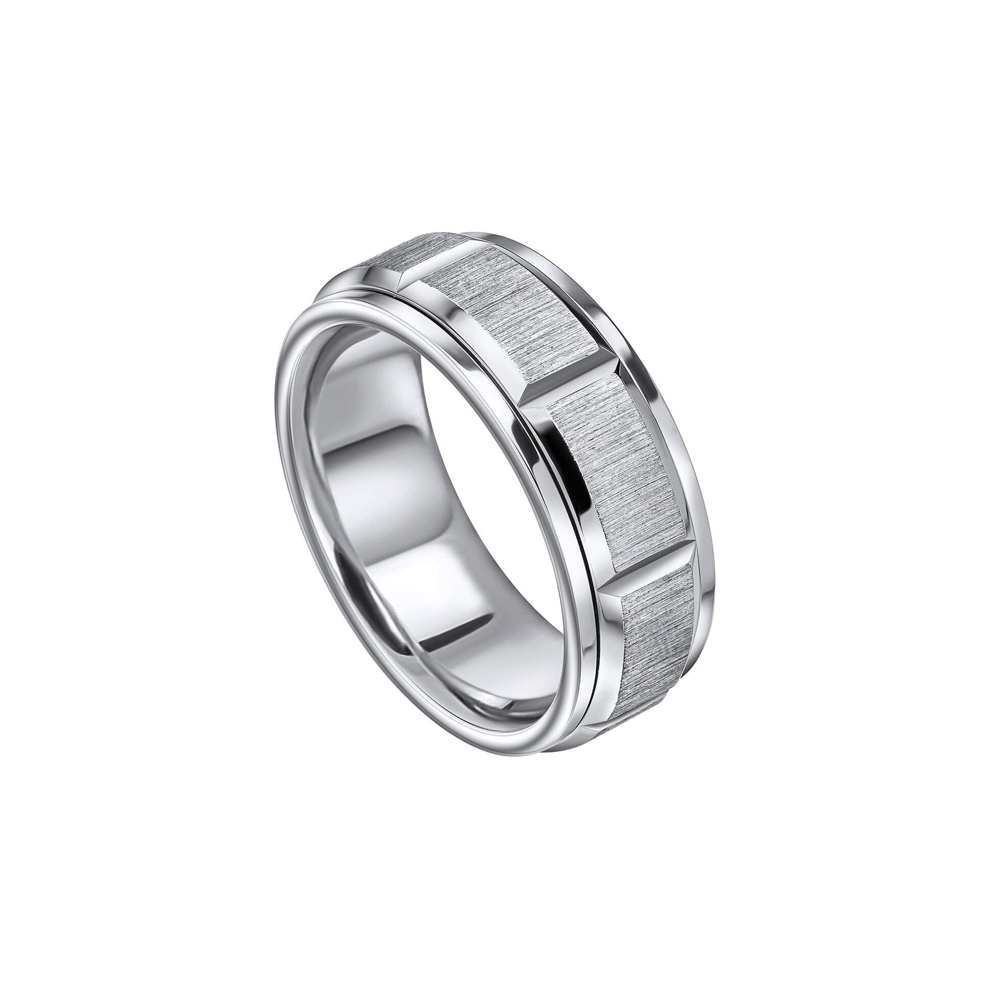 This spinner ring is a bold symbol of strength and resilience, inspired by the rugged beauty of natural rock formations. Crafted from stainless steel, its structured step-edge design exudes masculinity, while the central spinner band reflects the rhythmic movement of nature.