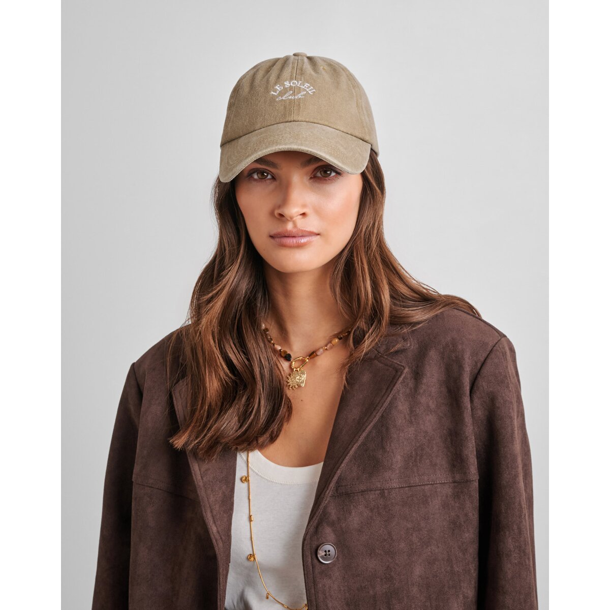 Le Soleil Embroidered cap in washed Taupe.