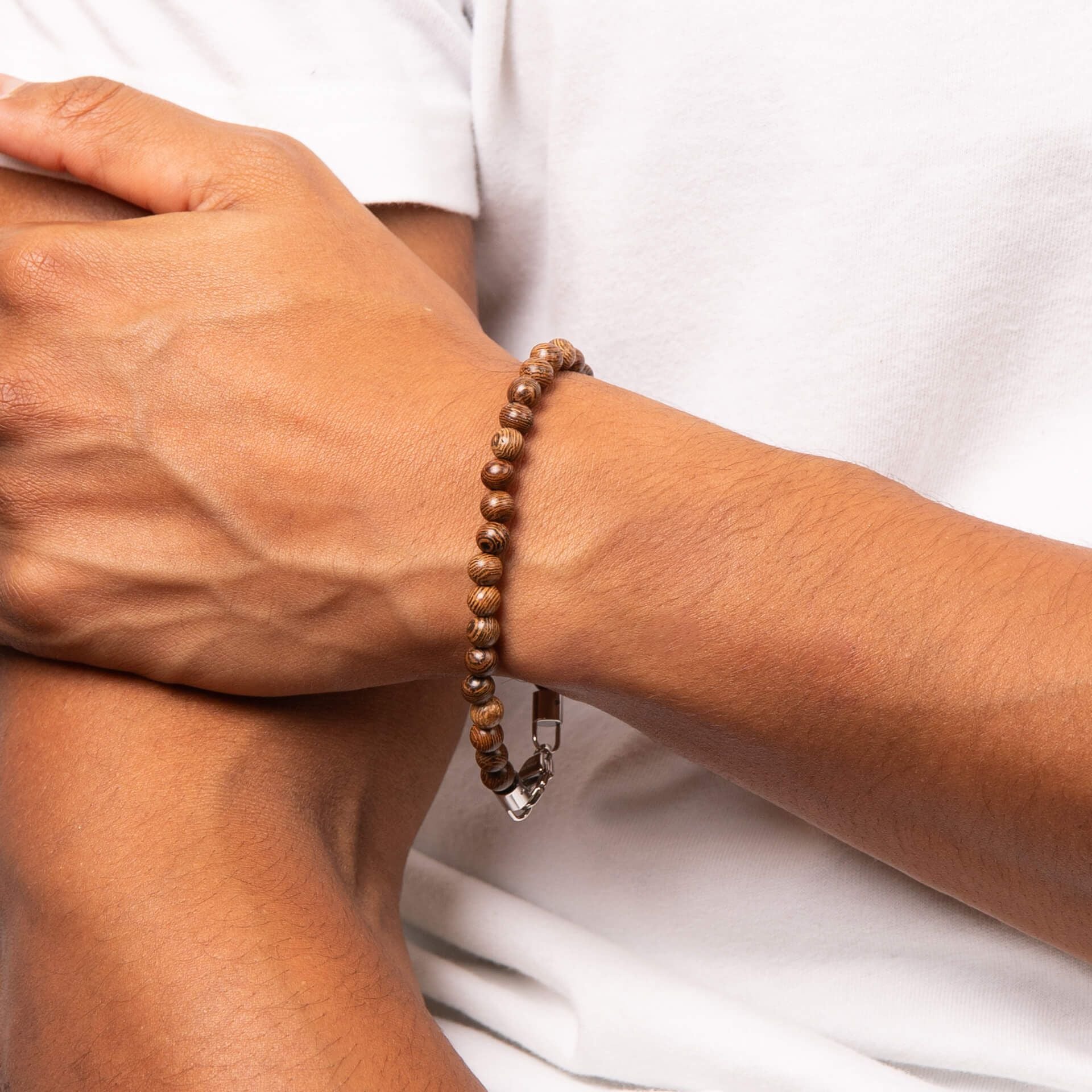 Connecting to nature and serving as a reminder of the world around us, this bracelet is crafted in stainless steel and features round natural wood beads. Lightweight and comfortable to wear, this bracelet will add a touch of sophistication to your everyday style.