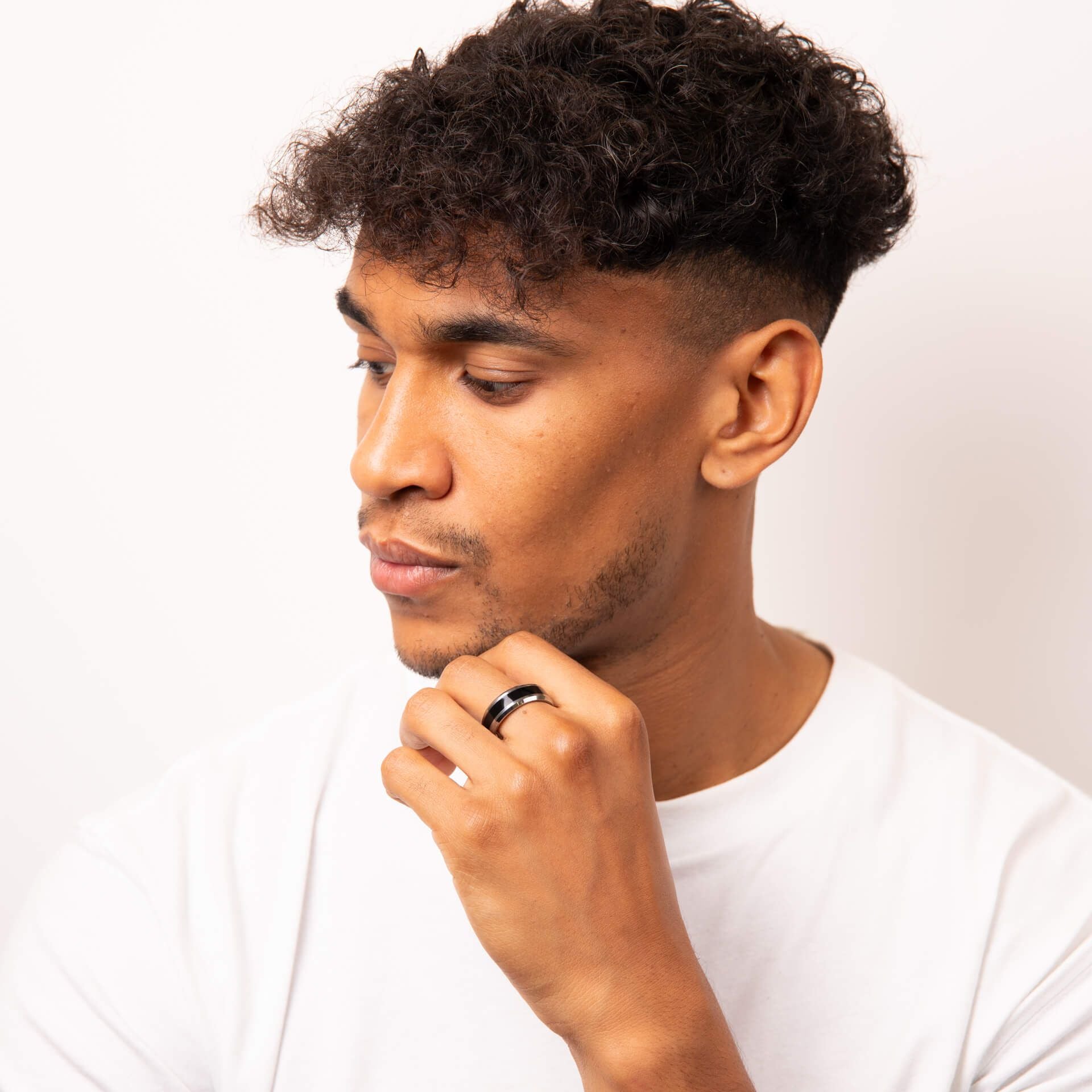 Grey shiny Tungsten ring featuring a black enamel stripe through the center for an additional modern take on a gents wedding band or everyday statement ring.