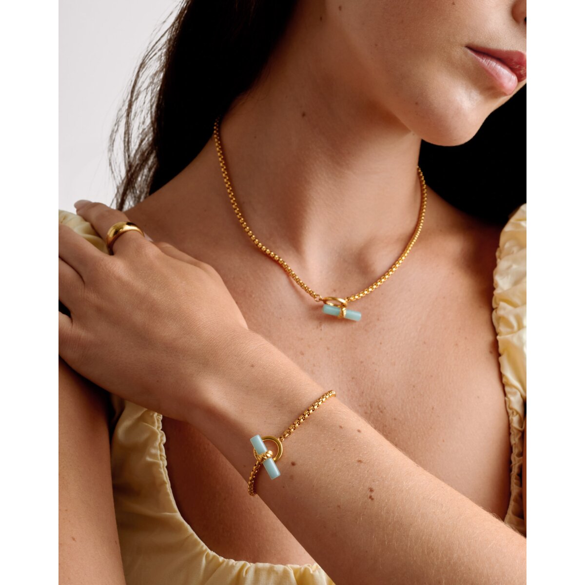 Azura Waterproof Gold T-Bar Bracelet is made with durable 18K Gold PVD coating, making it certified waterproof, sweat-proof, and life-proof. Featuring a real semi-precious amazonite stone in a timeless T-bar pendant design, it stands out beautifully on its own or paired with the rest of the collection.