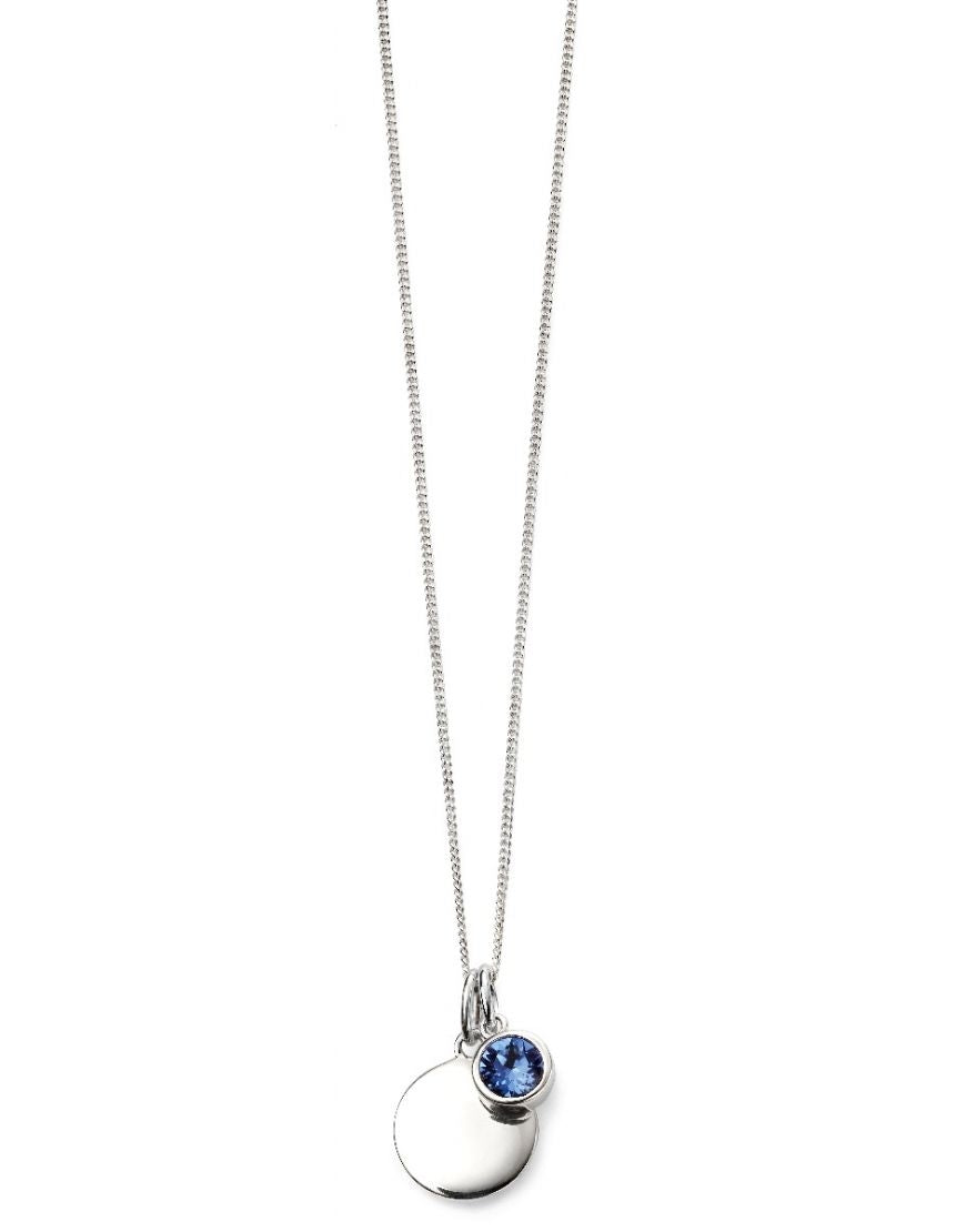 The Birthstone for September - Sapphire. Symbolic of sincerity and truth, sapphire means you are intuitive, intelligent and loyal. Made with swarovski crystal and sterling Silver. ENGRAVABLE disc pendant.
