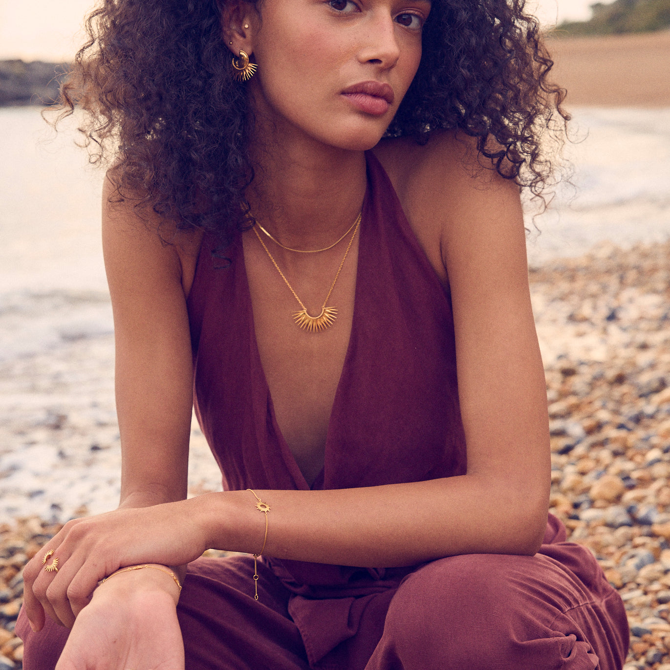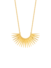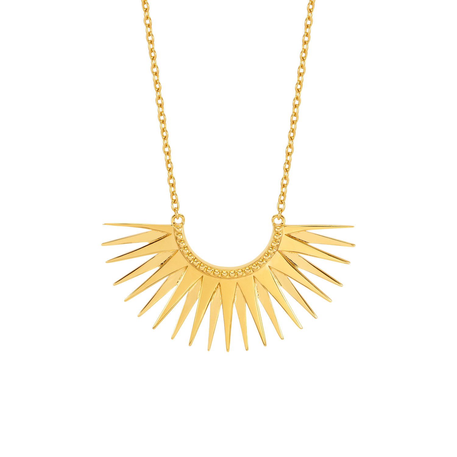 Radiate Brilliance, everyday. The Rising Sun Necklace exudes warmth and optimism and is part of the Electric Goddess collection. Hand-crafted from 22ct gold plated recycled silver, design features include an intricate layer of spike detailing, edged by tiny gold studs.
