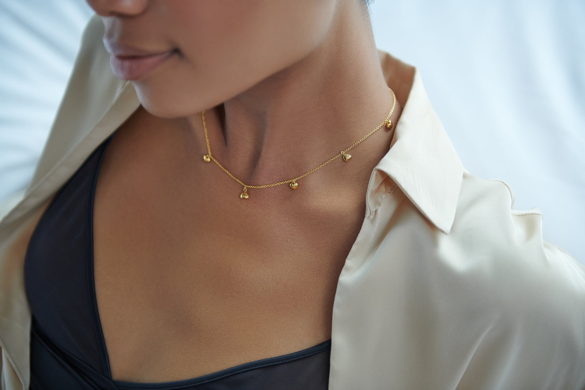 Wild at heart. Topsy turvy mini Deco grooved hearts are scattered across an adjustable length fine rolo chain necklace.