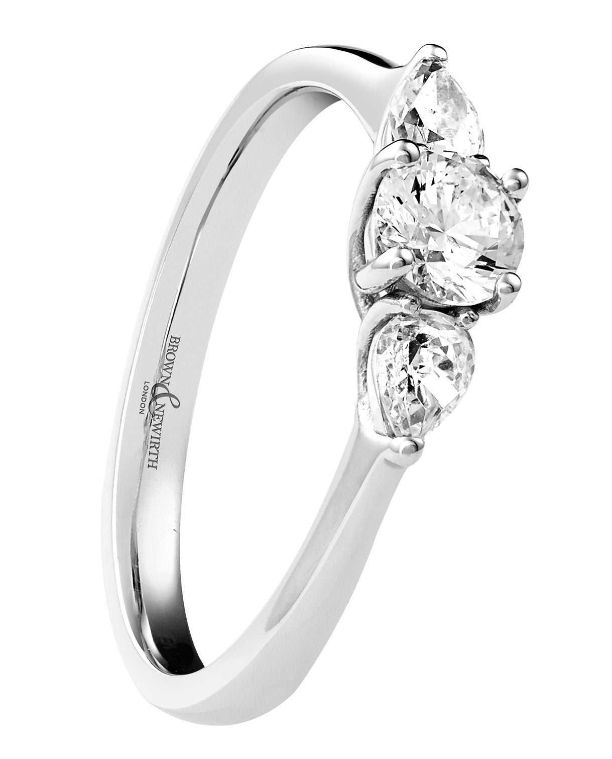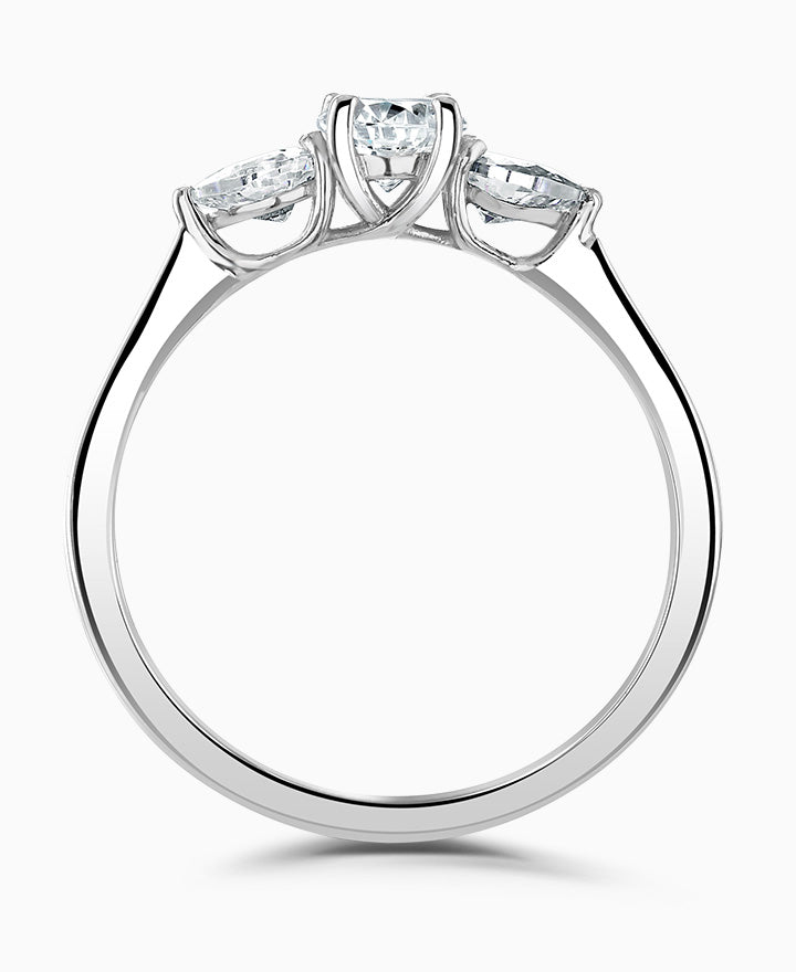 Handcrafted; a claw set trilogy with pear cut diamonds sitting either side of a round brilliant cut diamond, presented here on a straight edged band.