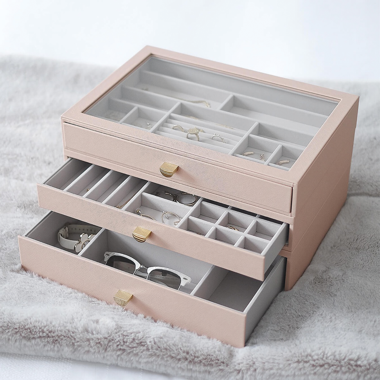There'll be no excuse for your favourite jewellery to be anything other than tangle-free and organised! The Supersize Drawer Set of 3 is ideal for almost every jewellery collection. With plenty of space to keep your necklaces, rings, earrings, watches and more, beautifully organised and safe. Featuring a clear glass lid for visibility and easy access to your favourite pieces. Whatsmore, you can easily add another jewellery drawer layer as your collection grows!