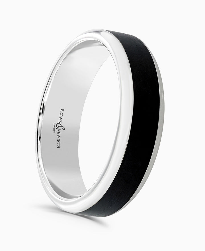 Make a statement. Handcrafted; our flat top profile with rolled edges and a black ceramic inlay in a brushed finish, presented in a medium gauge. Our wedding bands are hand rolled from a single piece of metal for the most luxurious and durable finish.