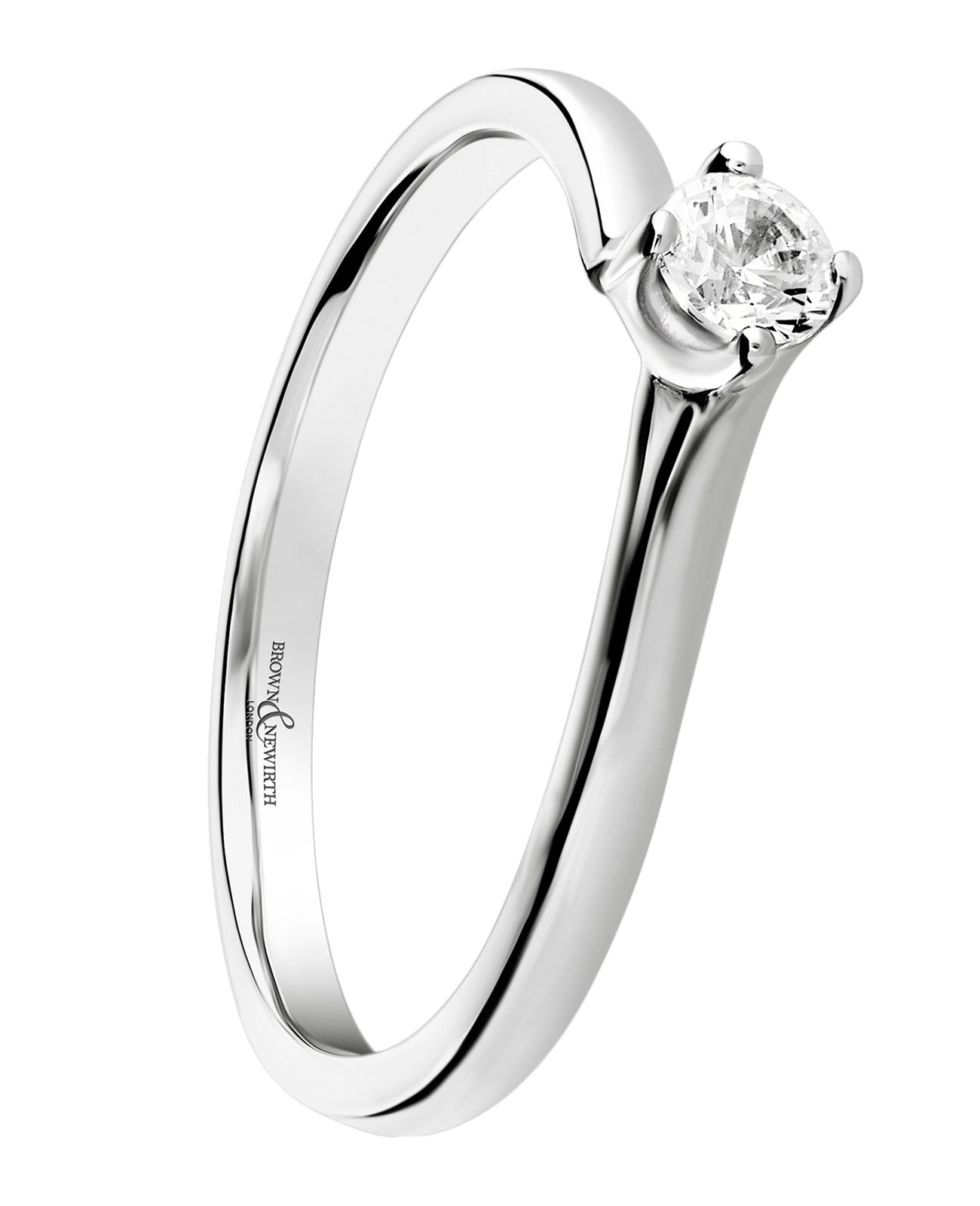 Modern classic. Handcrafted; a delicate four claw setting organically twists up to hold the round brilliant diamond, presented here on a classic court band.