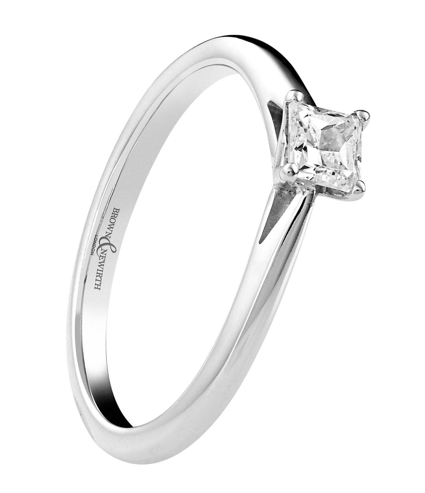 Timeless. Handcrafted; a delicate four claw setting perfectly elevates the square princess cut diamond, presented here on a classic court band.