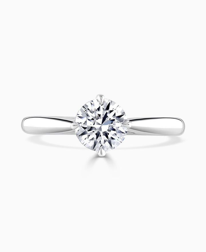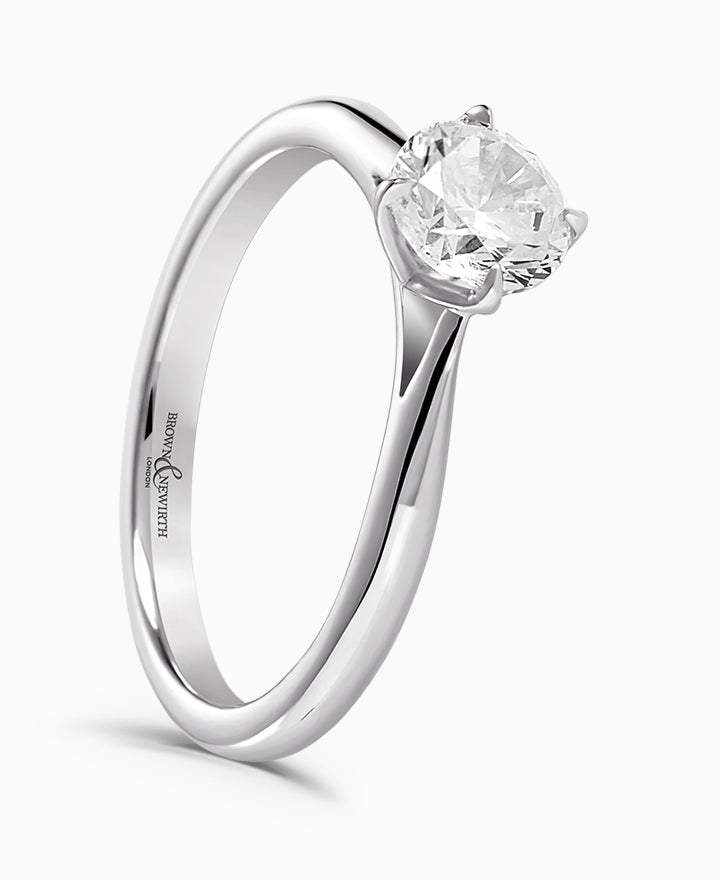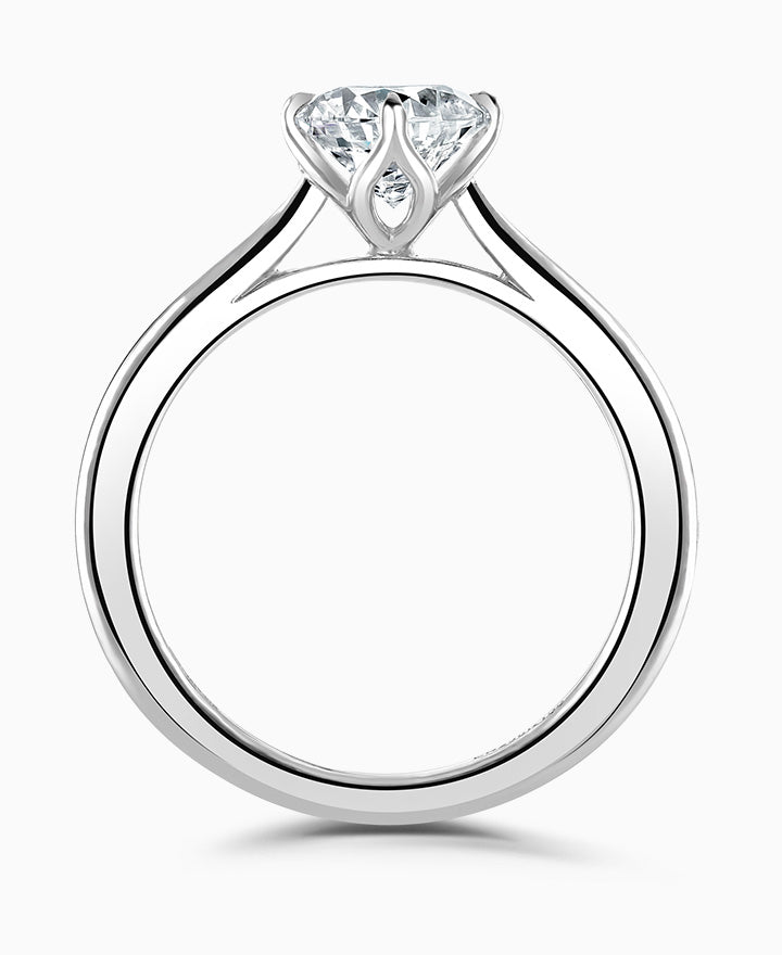 Signature. Handcrafted; our signature 'bloom' floral detailing for a round brilliant cut diamond, presented here on a classic court band. Part of the Bloom Collection.