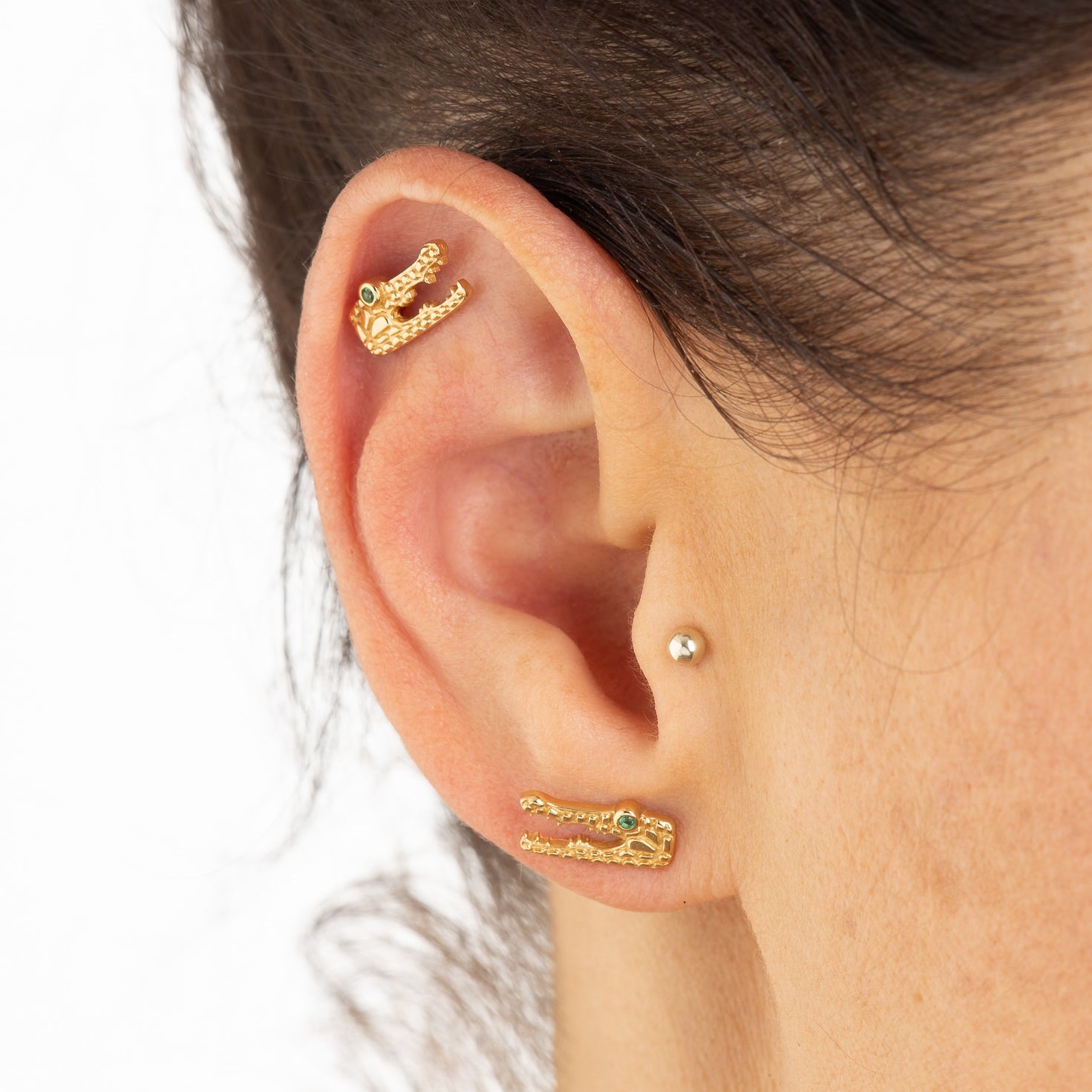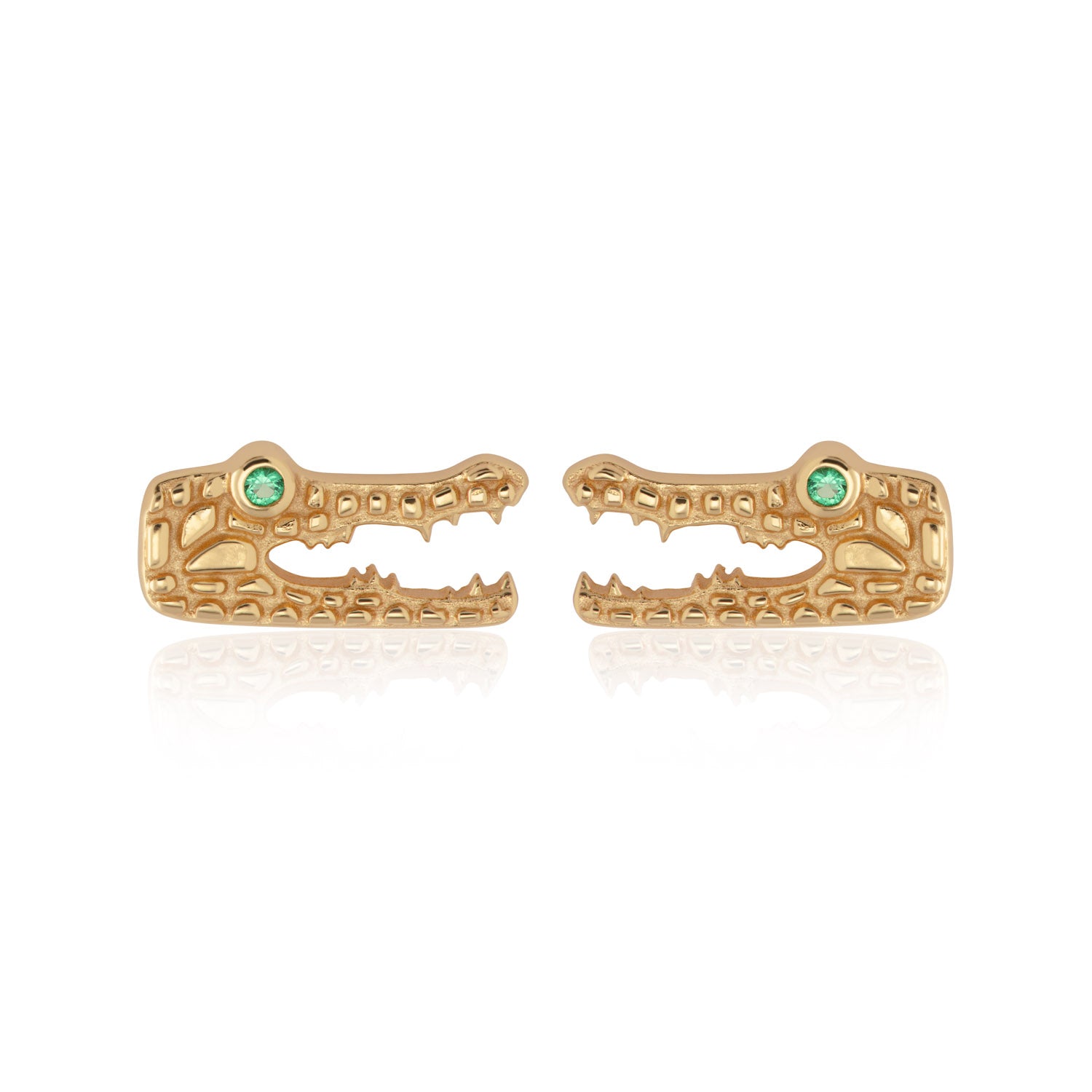 Say hello to these striking crocodile stud earrings with green eyes! Embracing strength and power these dainty crocodile head studs are cast from sterling silver and plated with 18 carat gold.
