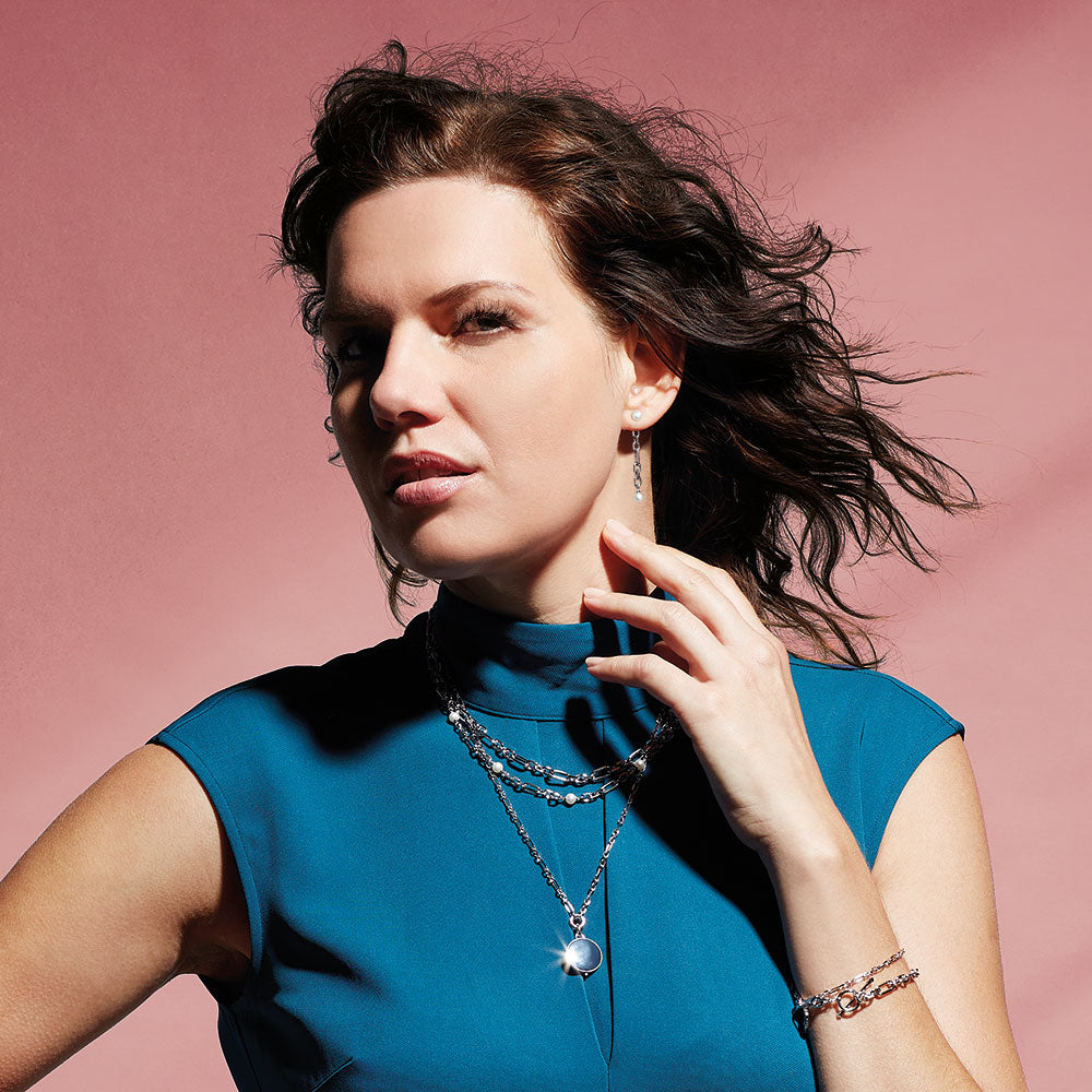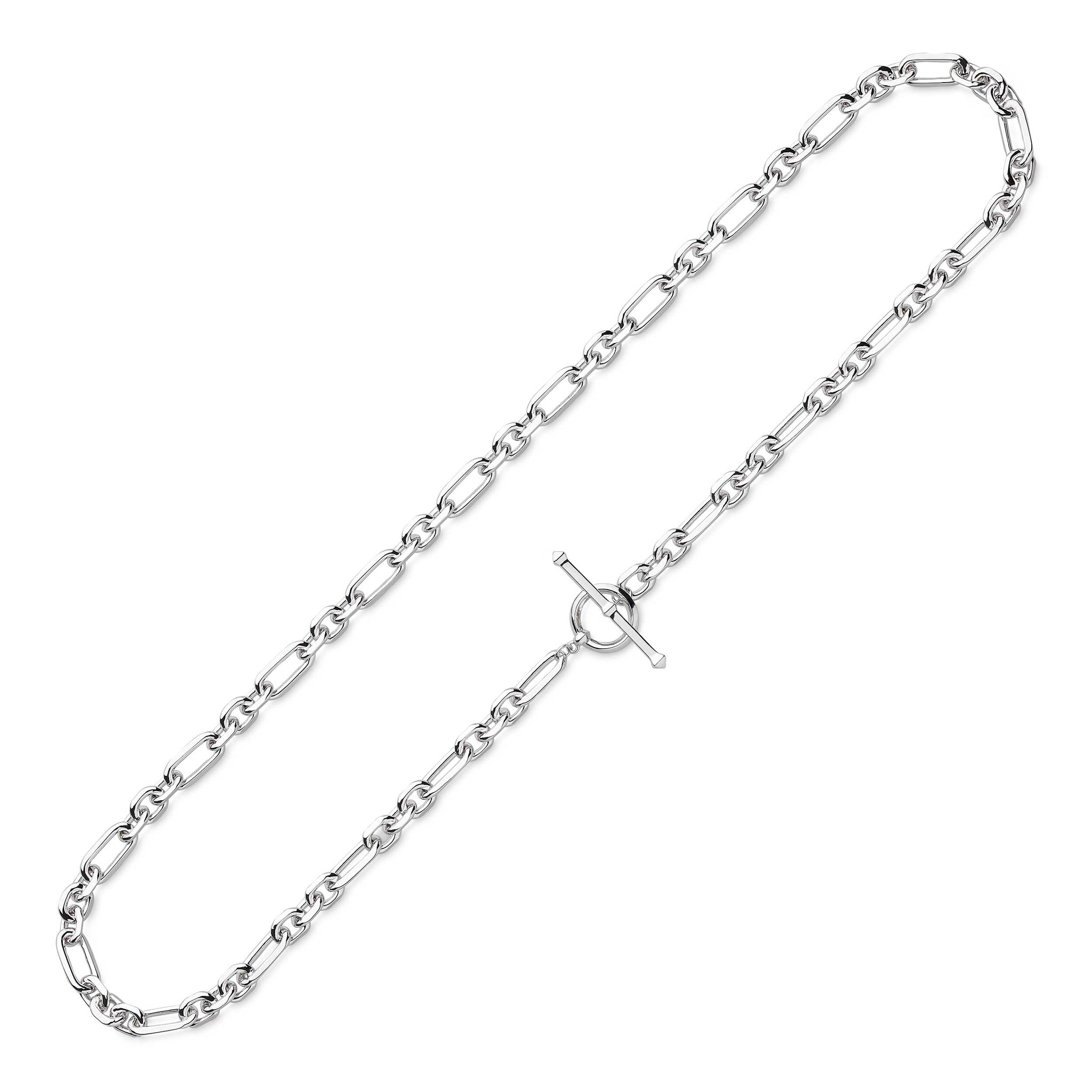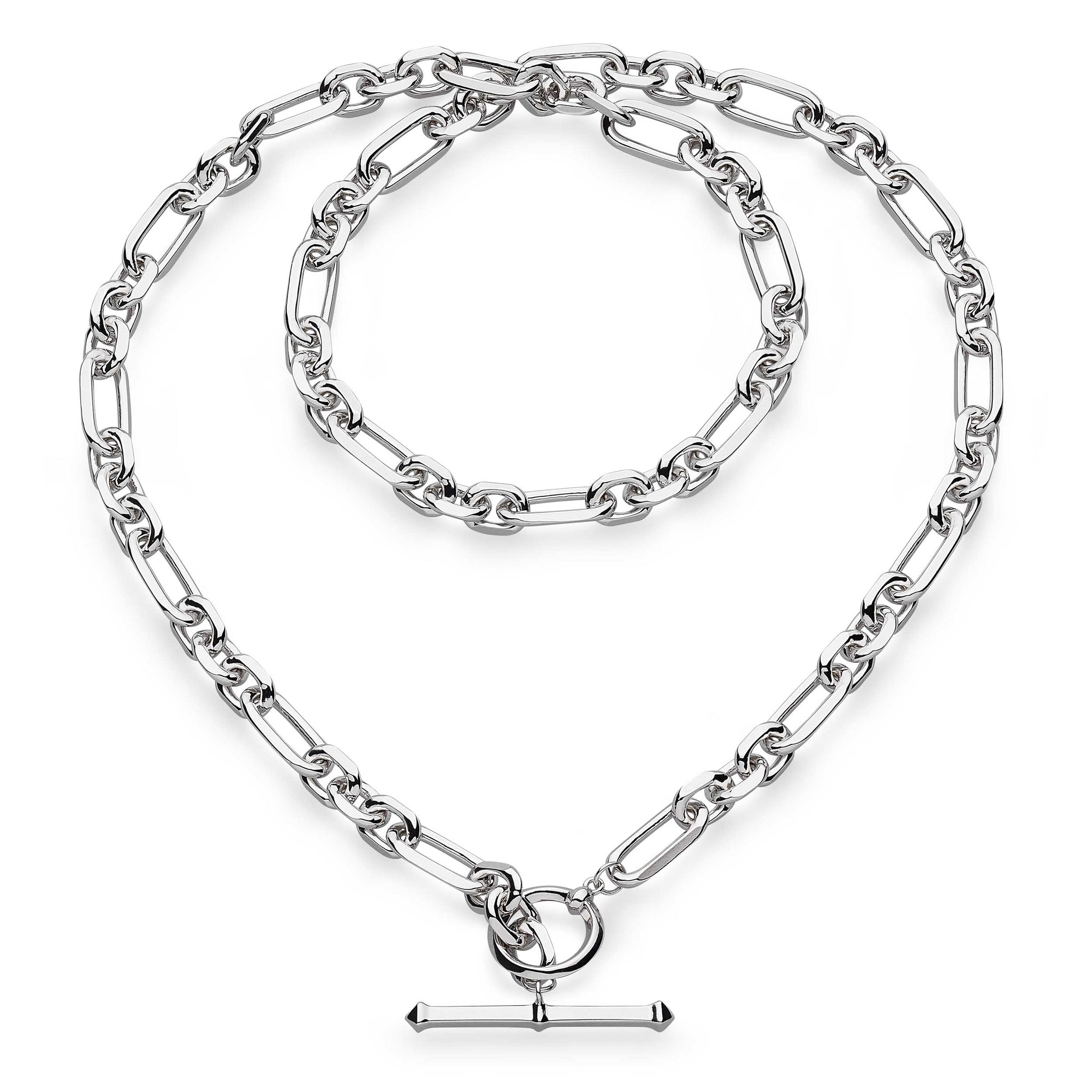 Astoria Figaro T-bar necklace in silver is a piece of pure beauty and sophisticated confidence. Designed in the edged Astoria-style links, the bold lines create the perfect profile for your modern and executive style. The angular T-bar clasp gives it that avant-garde edge, and whilst otherwise fixed in its 18-inch length, more wearing options open up by combining it to extend with the matching bracelet.