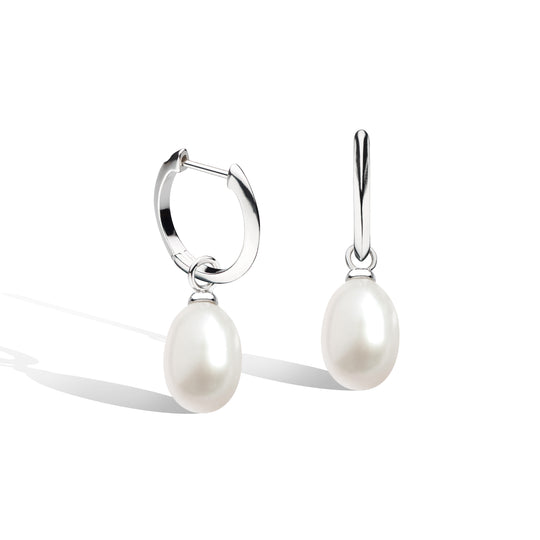 Feminine and demure, these on-trend silver hoop earrings feature organic in shape freshwater pearls, finished to luxurious, contemporary perfection. Sliding along the edged silver hoop in a charm-like drop, these modest huggie style earrings gently sway with your movements.