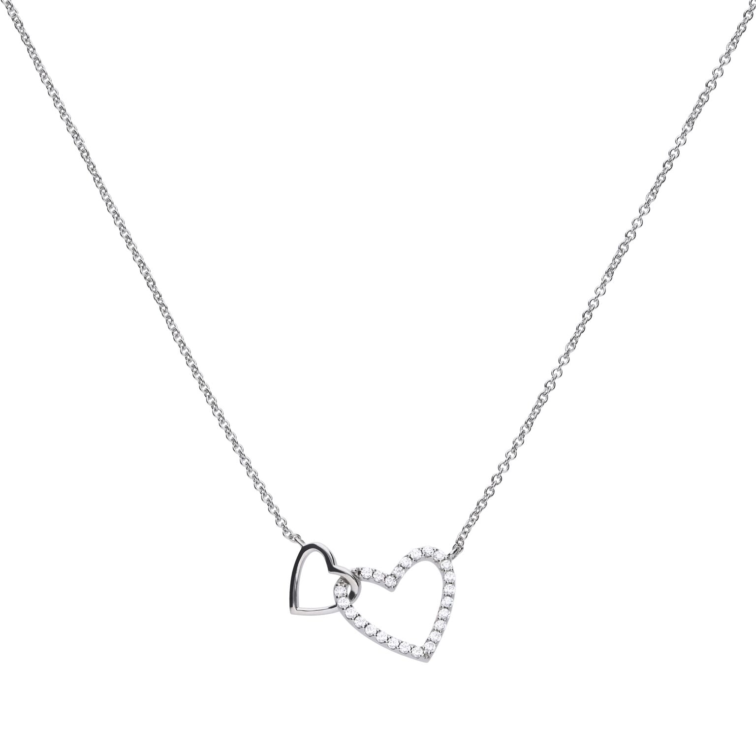 The double heart collier silver necklace with white zirconia stones and two meshing hearts. Made from sterling silver and diamond cut cubic Zirconia.