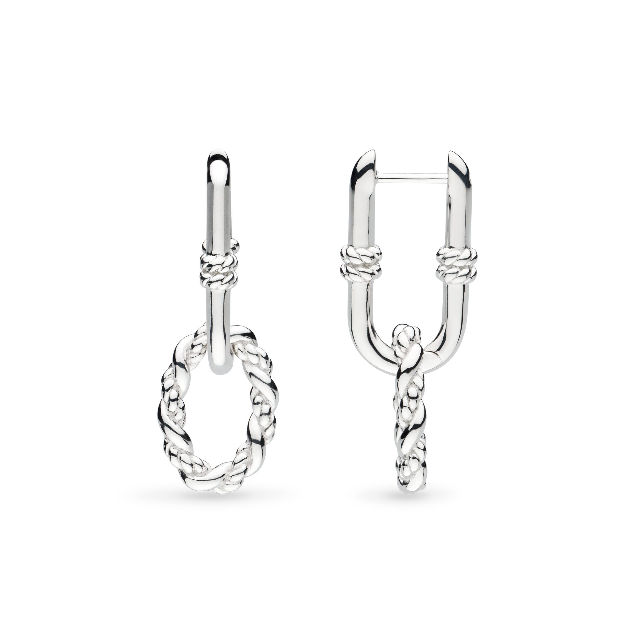 These Duo Grande hoop drop earrings feature a unique blend of elegance and seaside inspiration. The refined oval hoop shape, reminiscent of a chain link, is combined with a second ornate link with a twisting rope-like pattern, which can quickly be added or removed depending on whether your outfit calls for something simple or more decorative.