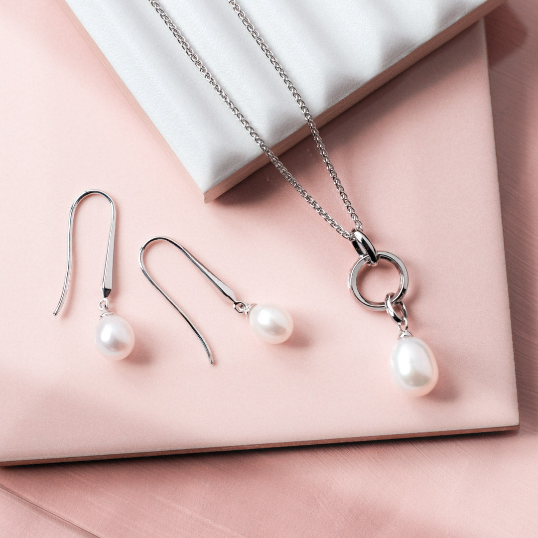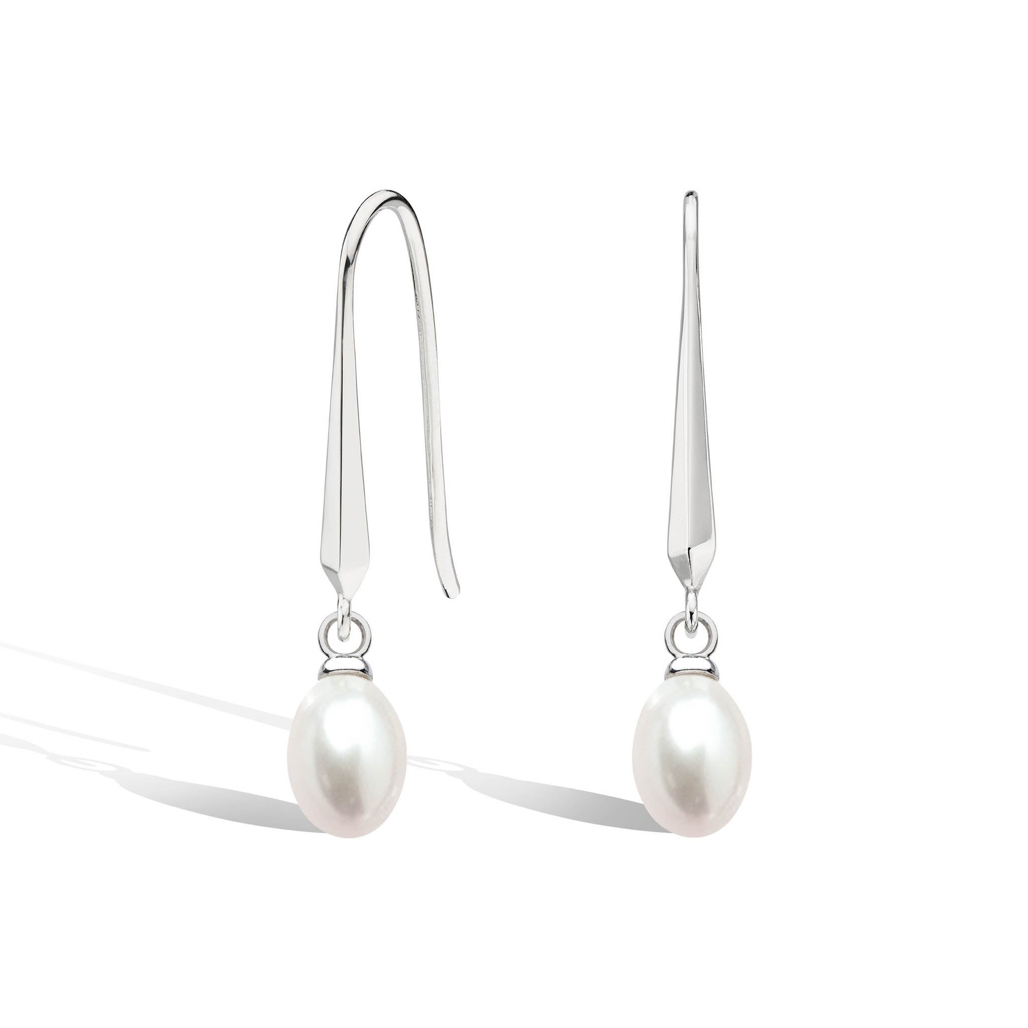 Styled to outright sophistication, freshwater pearls never looked so alluring! Made into these stylised pillar-esque drop earrings with long and sleek hook wires in our edged Revival style, each silver drop earring is perfectly complete with a softly feminine pearl drop.