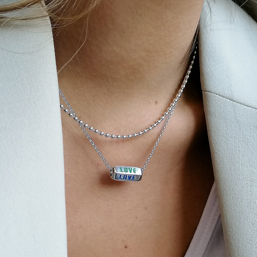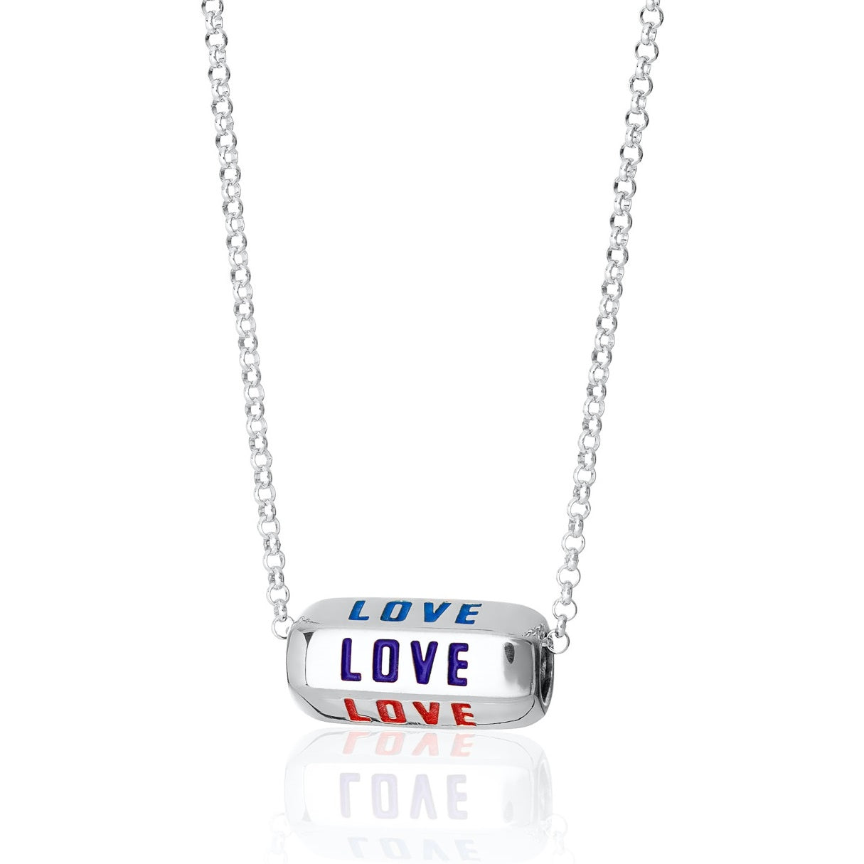 Add a colourful spin to your jewellery collection with this love is all around necklace. Crafted from sterling silver, this oval shaped charm features the word love engraved and decorated in glossy enamel, with colours inspired by the rainbow. Rotate the charm to see the different colours and read the repeated love affirmation. A trendy design that adds a playful spin to your everyday style, this love spinner charm necklace is an empowering piece that shows everlasting love!