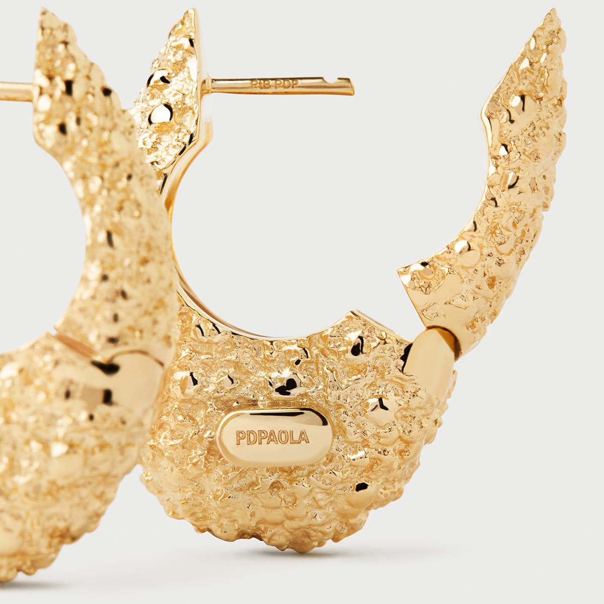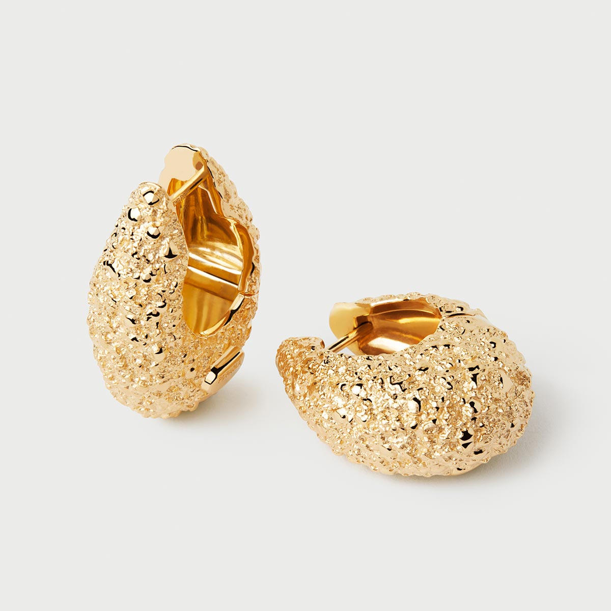 Chunky hoop earrings with a textured finish and embossed logo on 18ct gold plate.