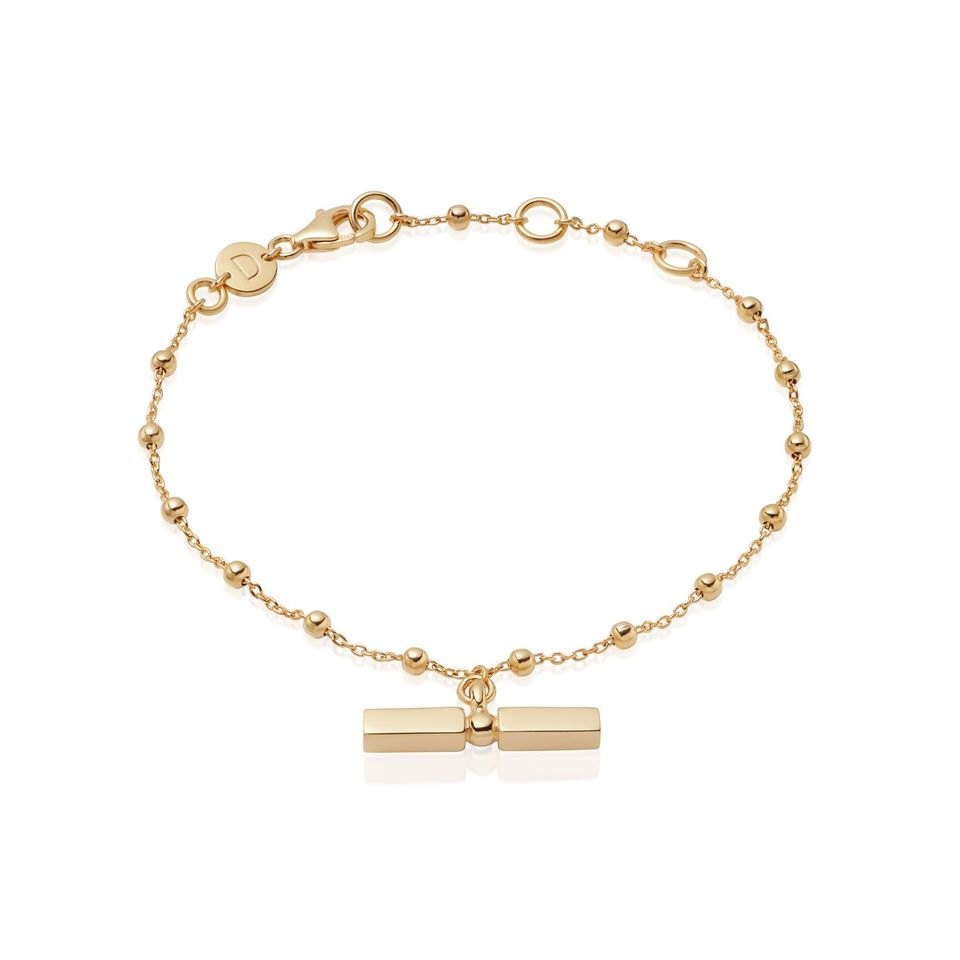Crafted in 18ct gold plated silver, this bracelet features a geometric t bar delicately hanging from a chic bobble chain.