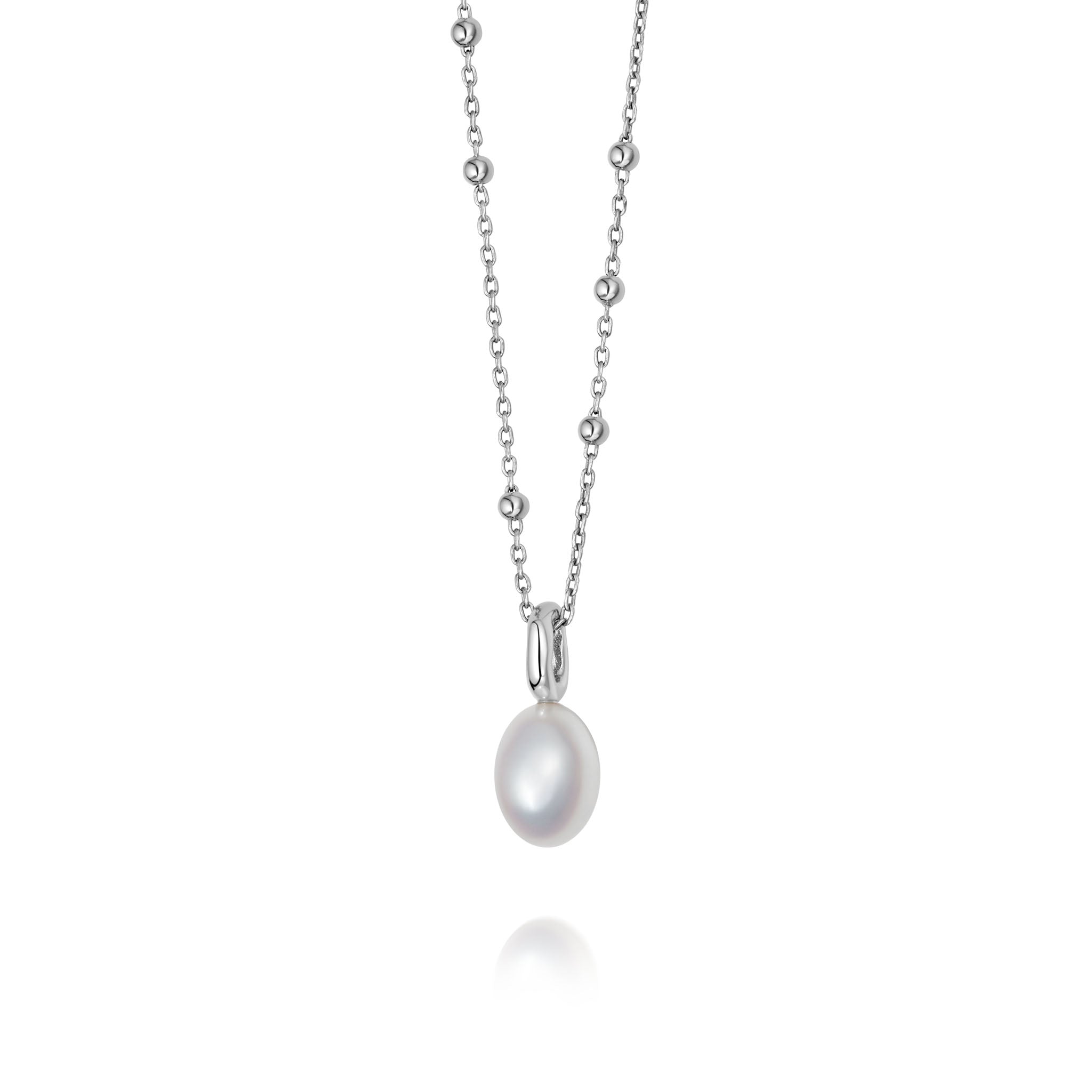 A timeless pearl necklace; an essential in every jewellery box. Crafted in sterling Silver, featuring a freshwater baroque pearl in both white, hung on an adjustable bobble chain. This classic piece is easy to style with every outfit.